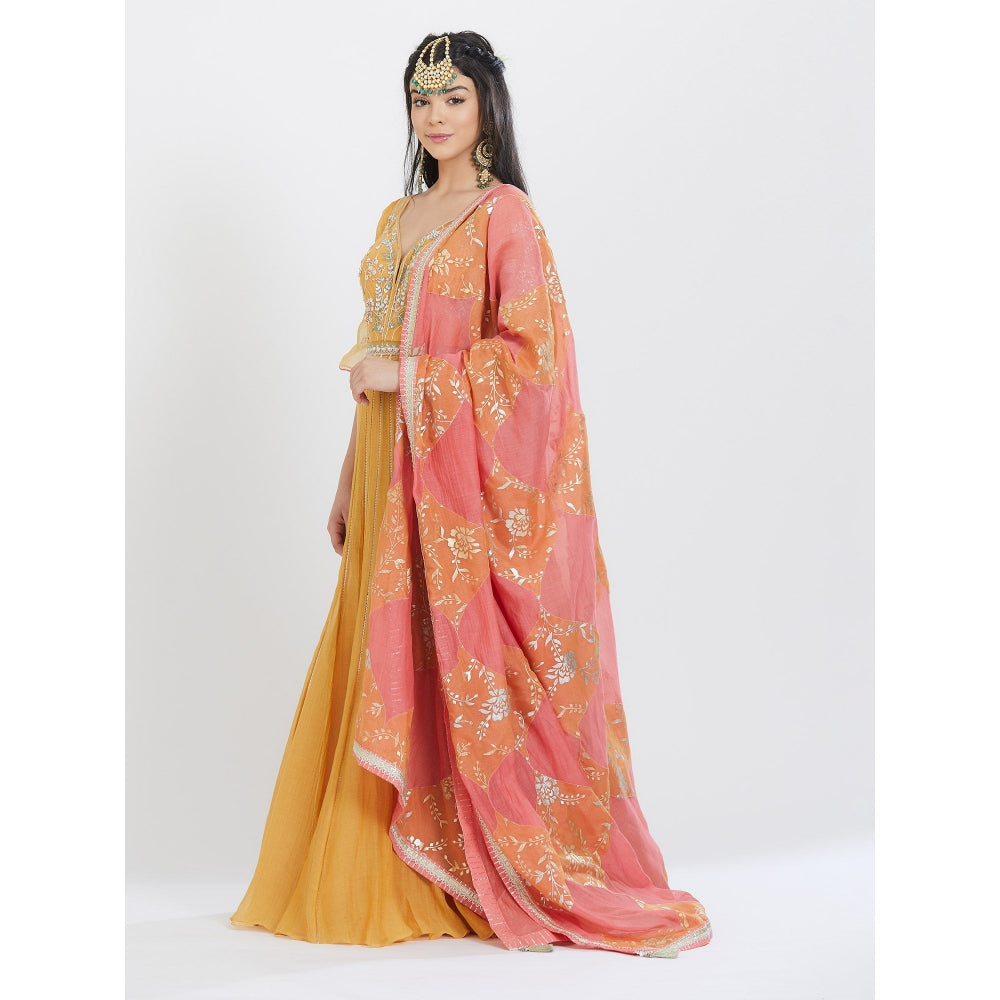 Description : Our yellow chanderi kalidar and lyrca churidar set is the perfect combination of elegance and playfulness. The beautiful hand foil printed dupatta, bedecked with applique work, is an added bonus!