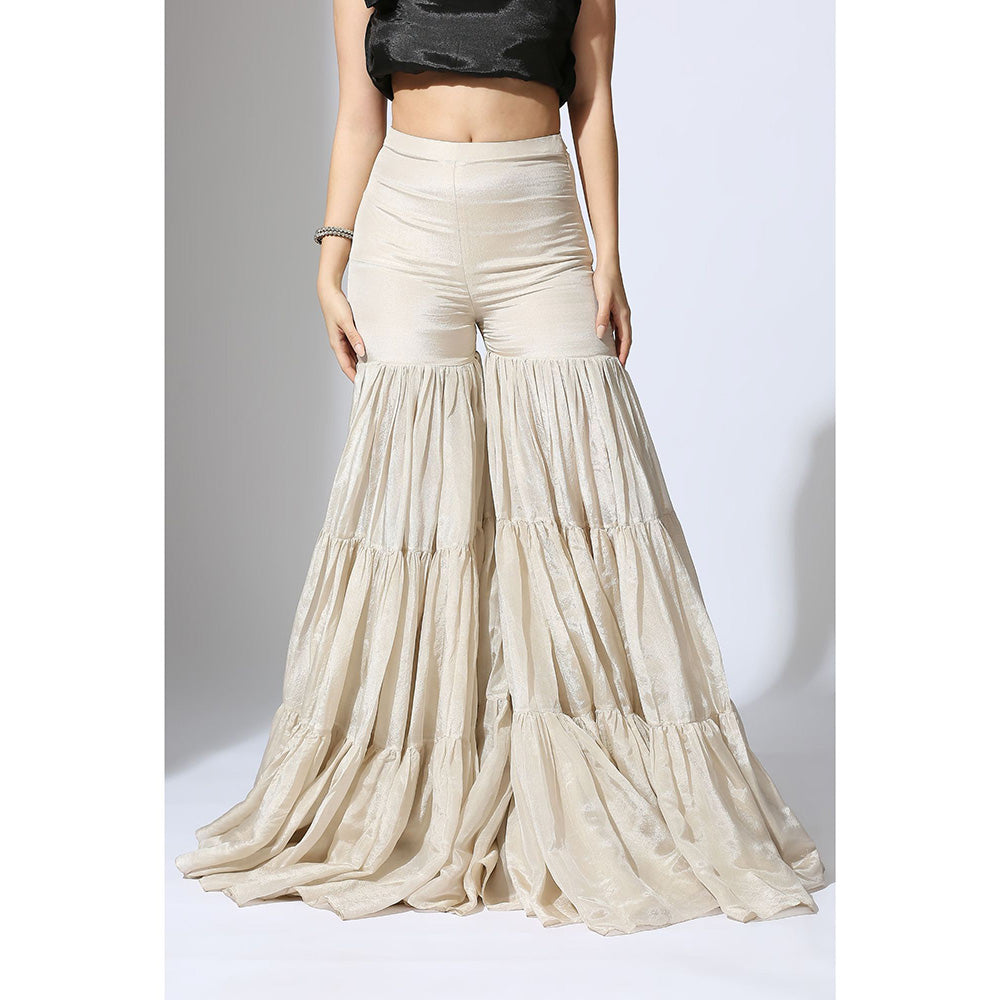 Description : Unleash your inner diva with this black sharara set from Masumi Mewawalla. Made from high-quality tissue, the kurta features a sleeveless design, a round neck, zipper closure and an embroidered pattern, finished with a high-waisted sharara and a stylish dupatta. Style it with minimal jewellery and sandals to complete the ensemble.