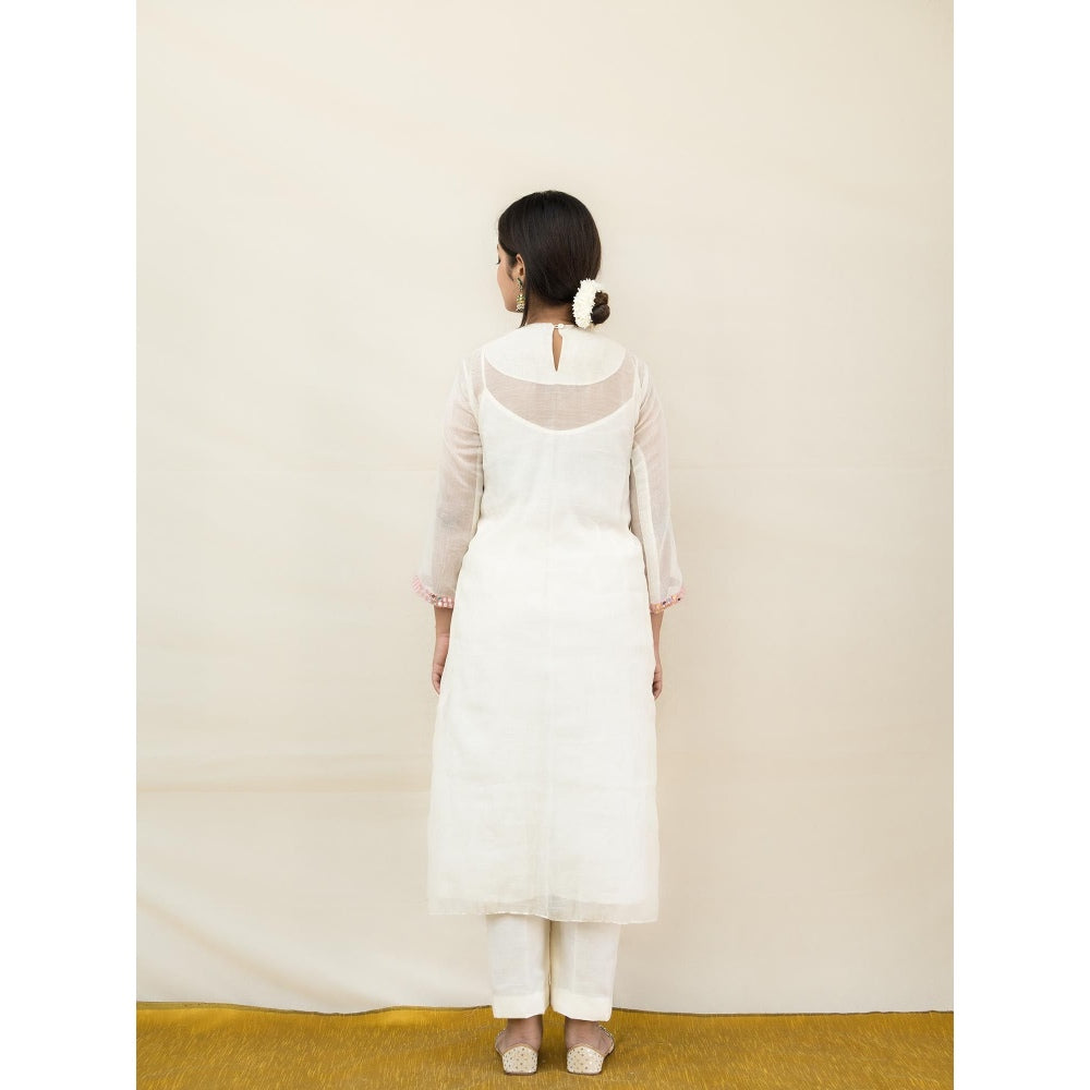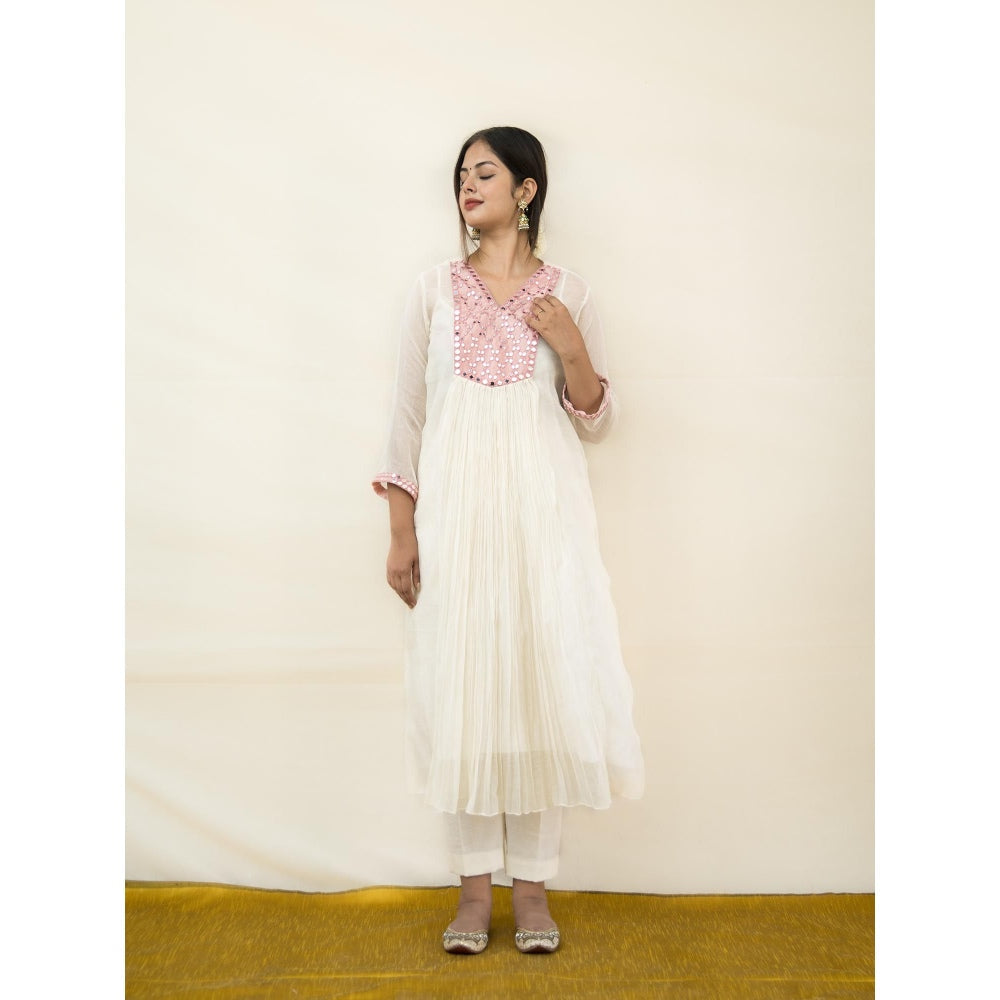 Ivory and Pink Meer Mirror Work Anarkali Kurta with Pant (Set of 2)
