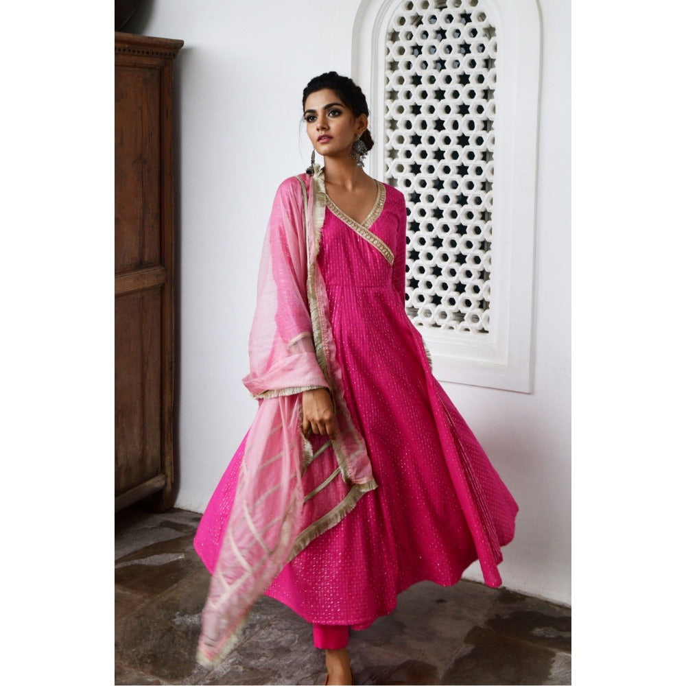 Description : Express your love for love for Indian wear in this pink kurta set from Myaara. Crafted using cotton lurex material, it features a three fourth sleeves and stylish design which gives an elegant finish to your look. Style it up with a pair of heels and golden jhumkas to complete the look.