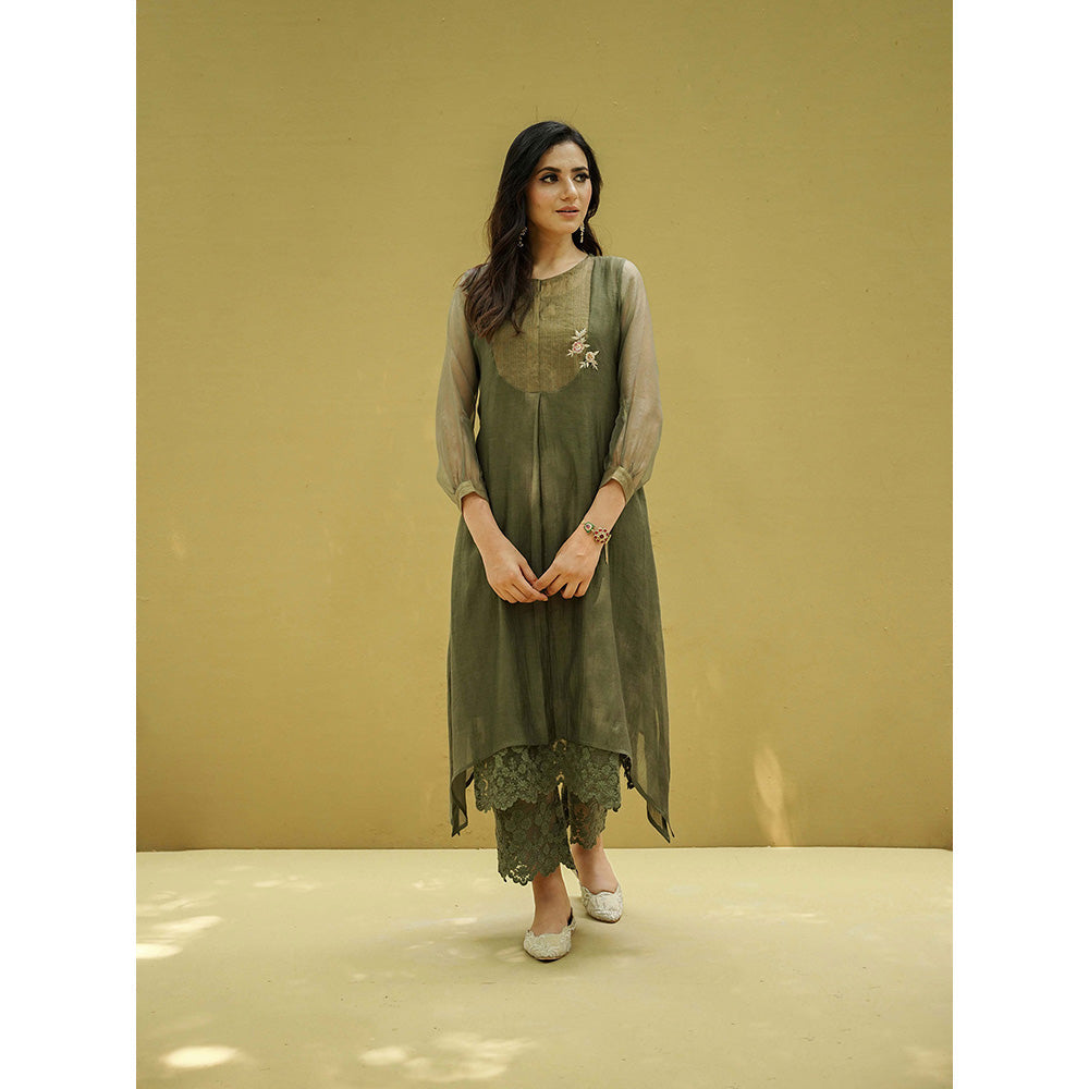 Description : Moss green kurta with tissue insert in the center, accented with a hand crafted flower in gold on the side.Thread embroidered organza details on sleeves and hem.A pair of pants in cotton, with organza details at the hem. Has a drawstring waist and a elasticised back band.