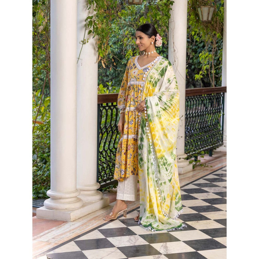 Yellow Orchid Hand Blocked Cotton Kurta with Pant and Dupatta (Set of 3)