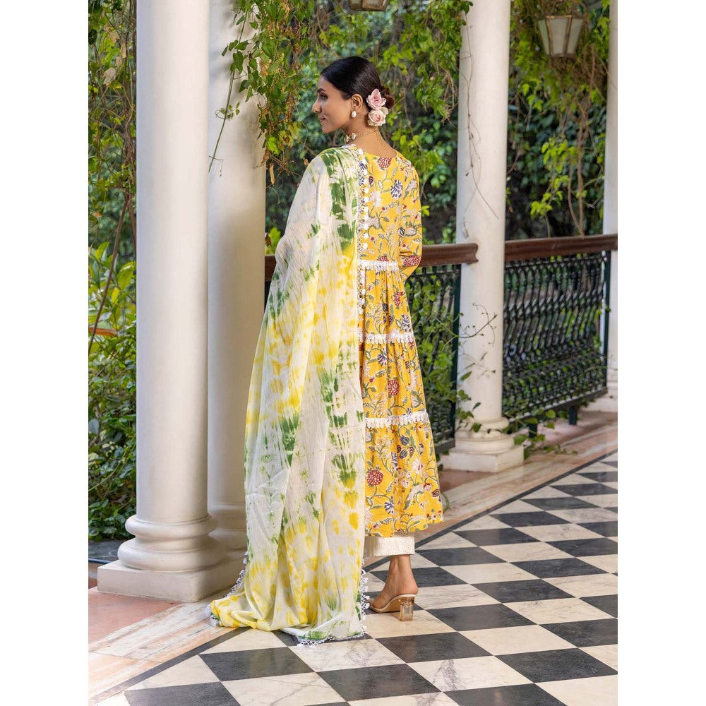 Naseebo Yellow Orchid Hand Blocked Cotton Kurta with Pant and Dupatta (Set of 3)