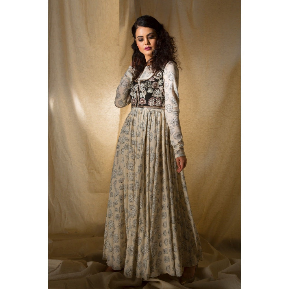 Off White Printed Anarkali with Embroidered Short Jacket and Pant (Set of 3)