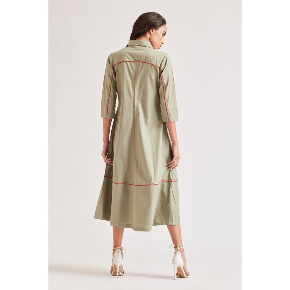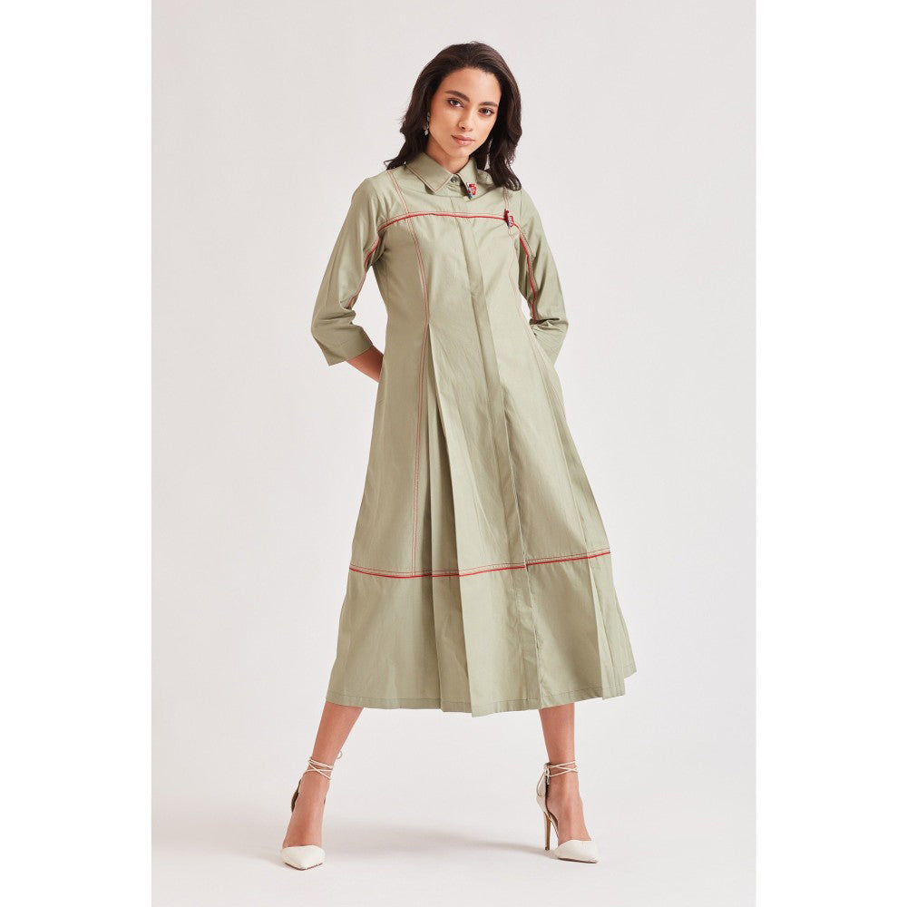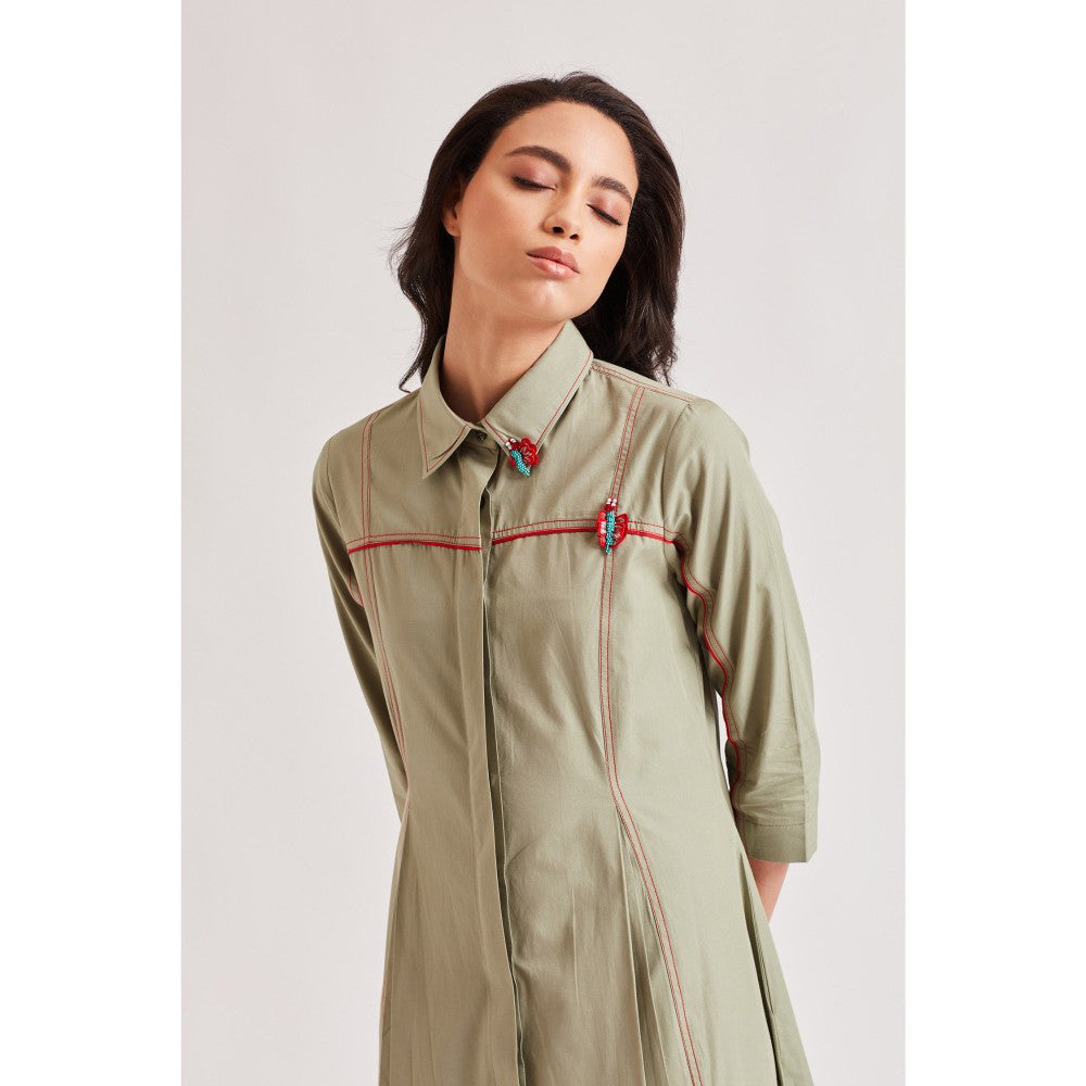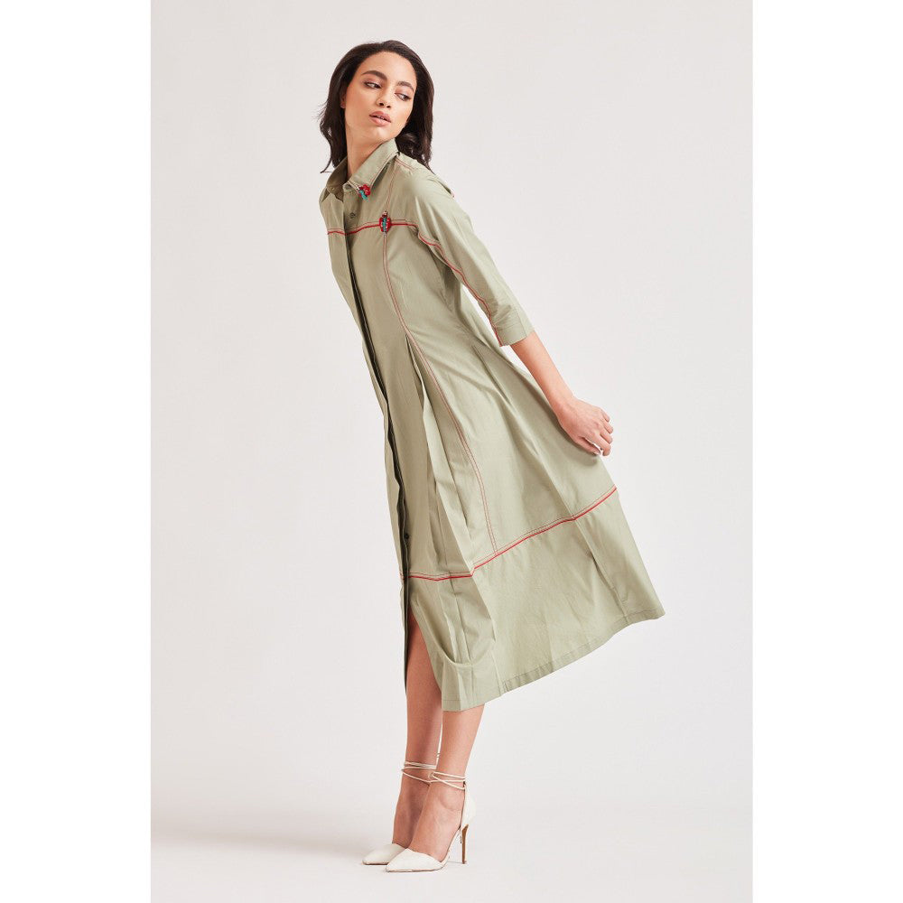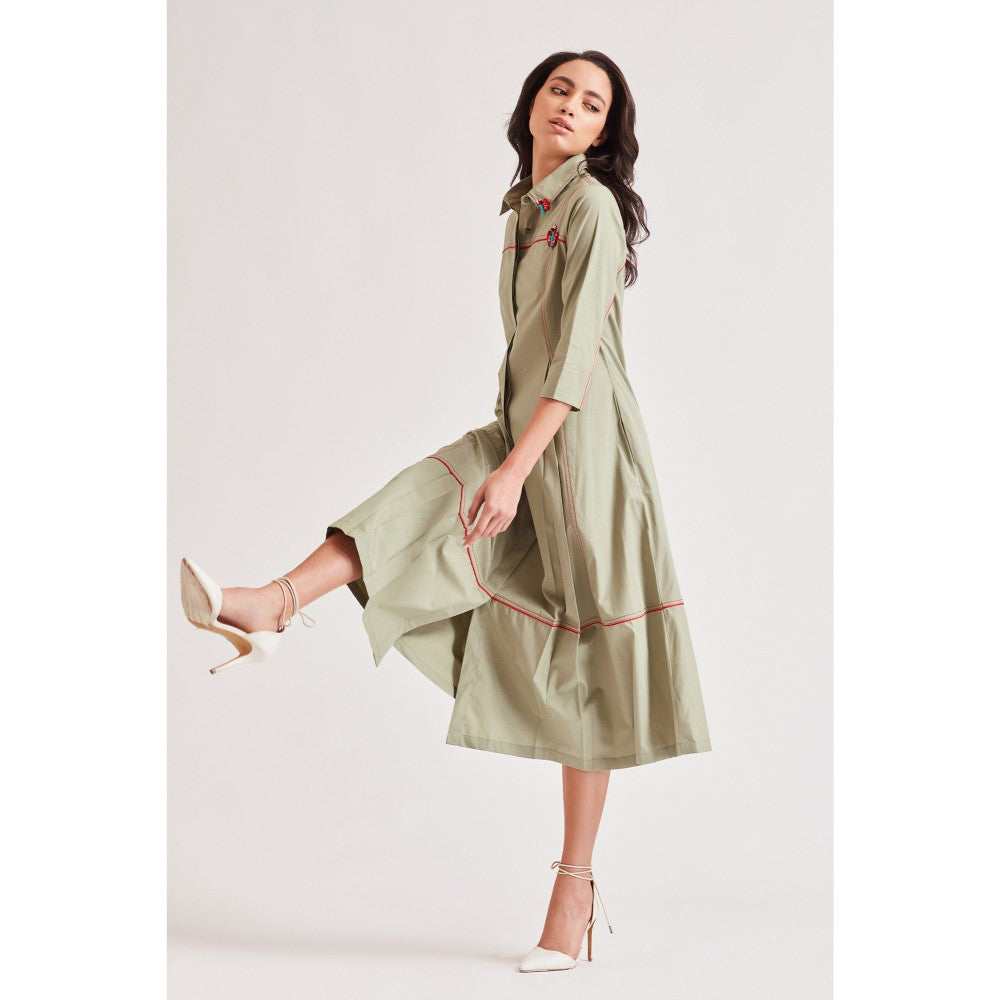 Description : Augment your fashion capsule with versatile options like this dress from Our Love. Features sage green cotton midi dress with 3D Butterfly appliques on the collar with red piping and stitch lines details. It has pockets and is a super comfortable and very effortless day look. Style it with statement jewellery and trendy heels.