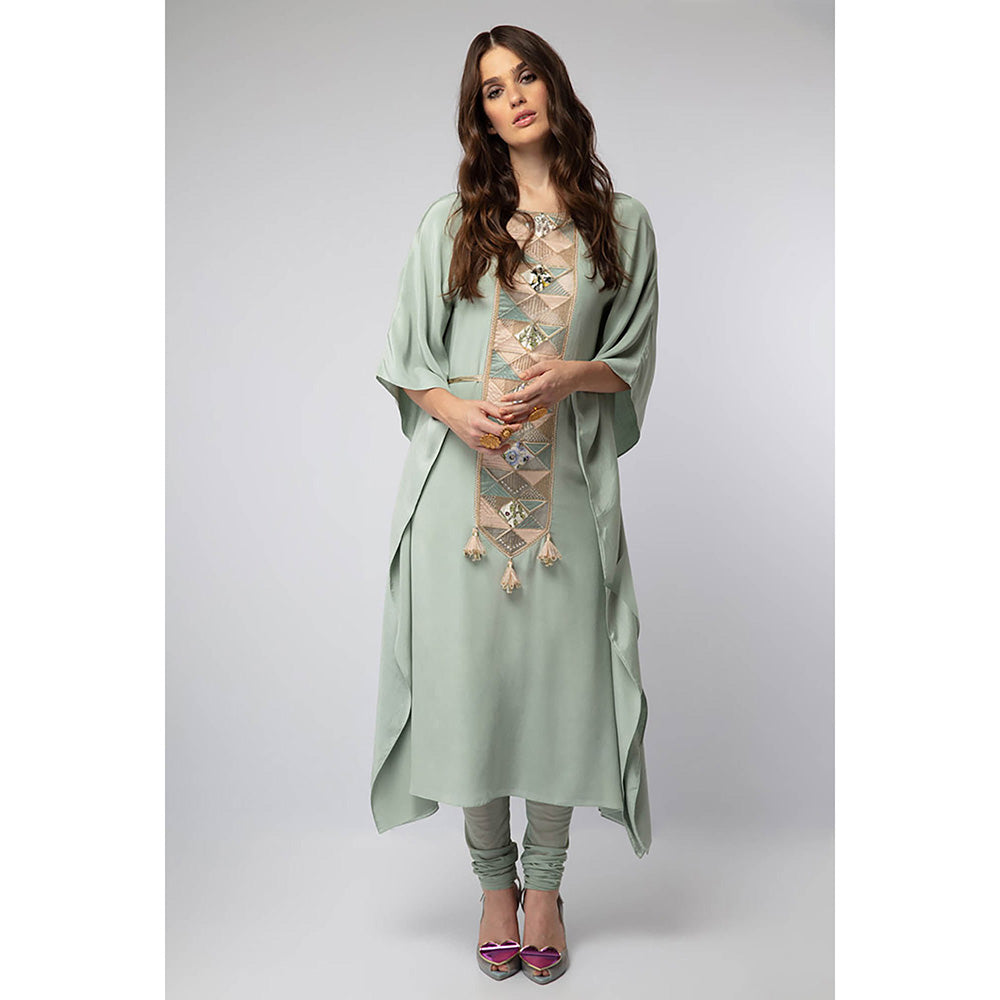 Description : Powder Blue Crepe Patchwork Embroidered Yoke Relax Fit Kaftan Tunic with Tie-Up Belt with Matching Powder Blue Soft Net Churidar