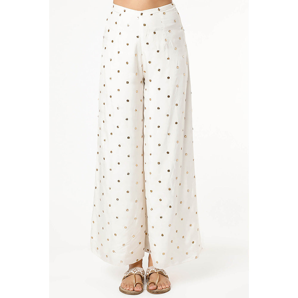 Description : Off White Dot Mukesh Crepe Yoke Embroidered Kaftan with Palazzo and Belt.