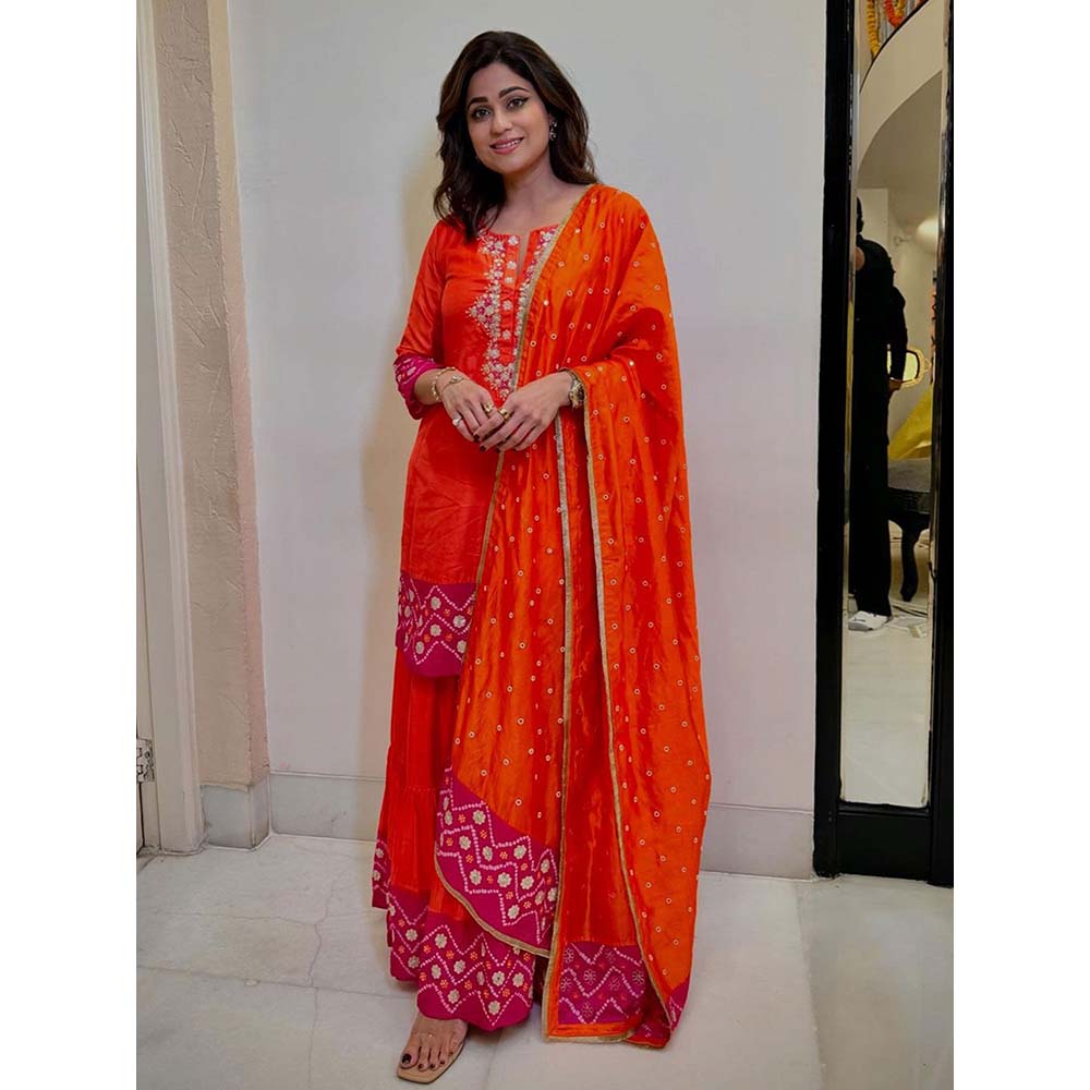 Description : This orange coloured pink bordered Sharara set has been handcrafted with gota, mirror, shell, and Moti work. Just the right fit for all your desi occasions, be it a keertan or a wedding. After all for a queen to rule, the clothing is her tool.