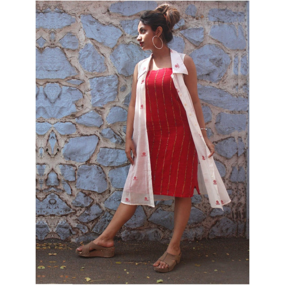 White Shirt Dress In Jamdani Fabric with Red Slip