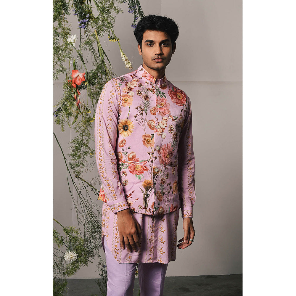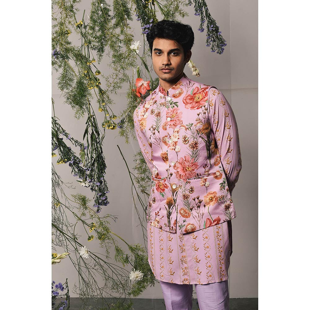 Description : Floral print bandi constructed with a rich linen satin fabric. This bandi features laser cut mother of pearl shell buttons, a mandarin collar, one chest pocket and two hip pockets. This is a single product and does not include a kurta and pajama. Please note - No two laser cut mother of pearl buttons will be exactly the same, which adds to the uniqueness of this piece.