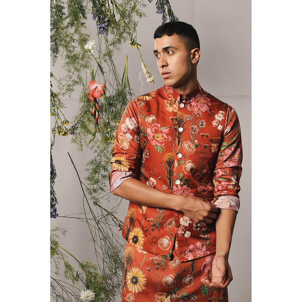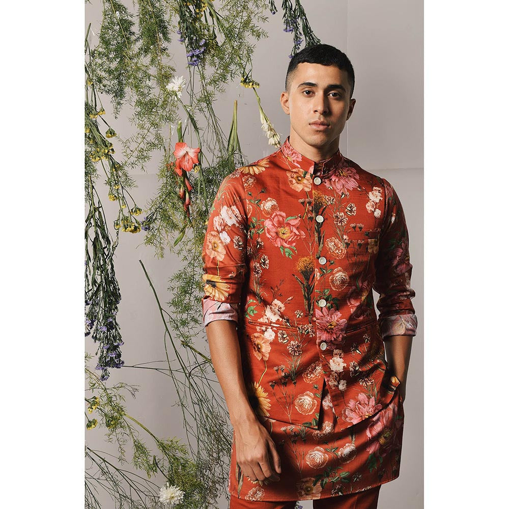 Description : Floral print bandi constructed with a rich linen satin fabric. This bandi features laser cut mother of pearl shell buttons, a mandarin collar, one chest pocket and two hip pockets. This is a single product and does not include a kurta and pajama. Please note - No two laser cut mother of pearl buttons will be exactly the same, which adds to the uniqueness of this piece.
