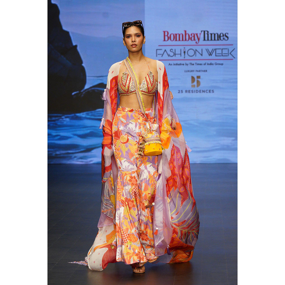 Rishi & Vibhuti Orange Sunset Charm Top With Pant And Shrug (Set of 3)