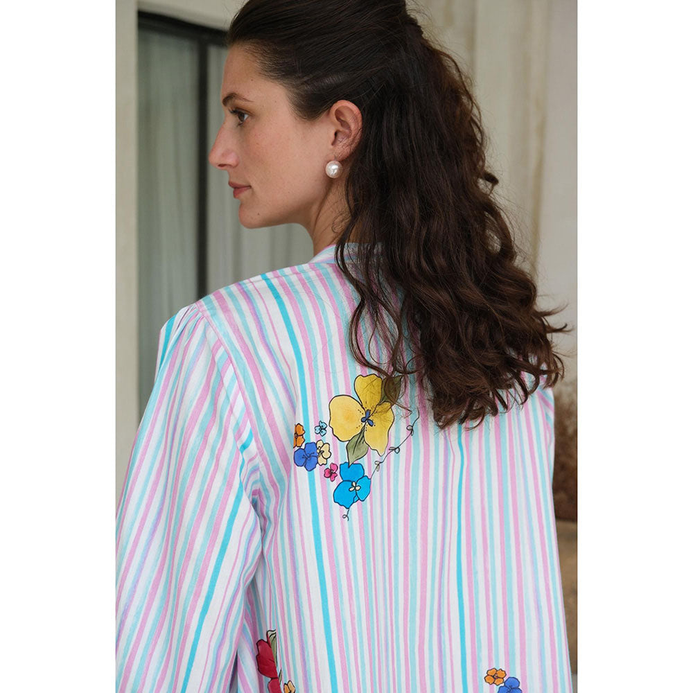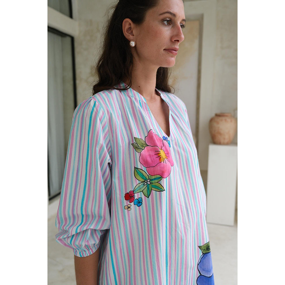 Description : The Wisteria Skater Dress: A Whimsical Short Dress with A Slit Collar, Pleated Sleeves, and Colourful Stripes. Adorned with Delicate Watercolour Buttercups Cascading From The Neck To The Sweep.