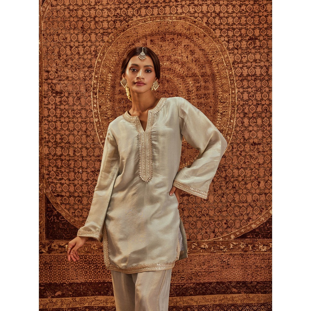 Description : Refresh your closet this festive season with this kurta set. Crafted from tissue fabric, with lace detailing on the edges making it a classic piece.
