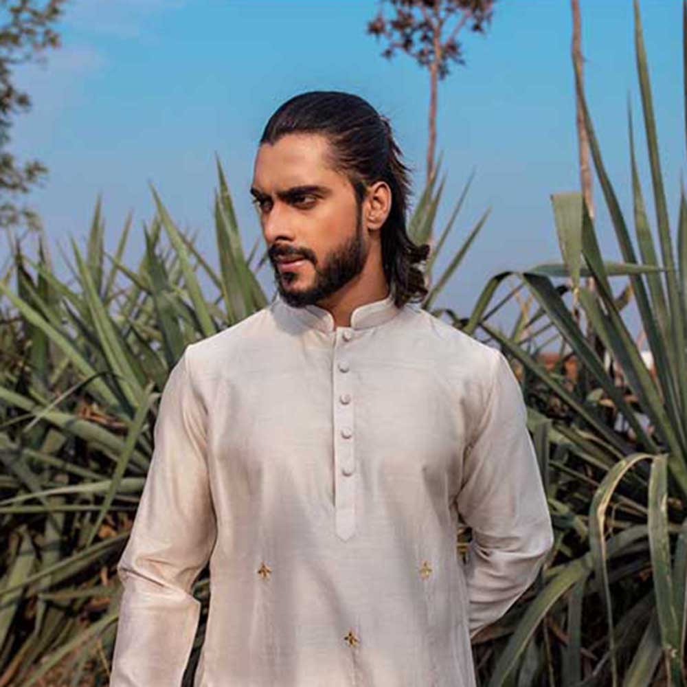 Description : Leave the crowd spellbound by stepping out in this captivating aero ivory kurta with pant from Runit Gupta. Made from high-quality chanderi, this piece features full sleeves and a mandarin neck. Style it with a watch and shoes to complete the ensemble.