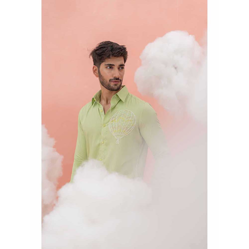 Description : A Light Green Vegan Silk Shirt, Meticulously Hand-Embroidered With Cut Pipes In White, Blue, Pink, And Yellow, Forming A Vibrant Hot Air Balloon. This Design Captures The Fresh And Exhilarating Vibes Of Summer, Blending Formal Elegance With A Playful After-Party Spirit. Perfect For Those Who Want To Infuse Their Wardrobe With A Touch Of Adventure While Maintaining APolishedLook.