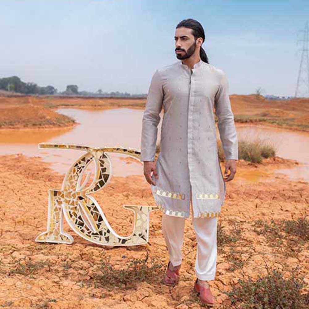 Description : Leave the crowd spellbound by stepping out in this captivating grey khidki kurta with salwar from Runit Gupta. Made from high-quality chanderi, this piece features full sleeves and a mandarin neck. Style it with a watch and shoes to complete the ensemble.