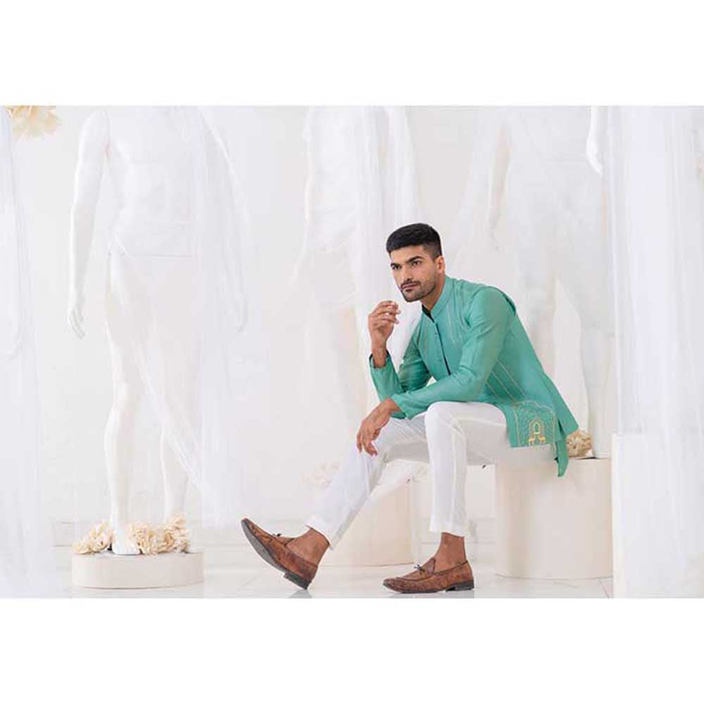 Description : Leave the crowd spellbound by stepping out in this captivating teal summer bundi jacket from Runit Gupta. Made from high-quality chanderi, this piece features a sleeveless design and a mandarin neck. Style it with a watch and shoes to complete the ensemble.
