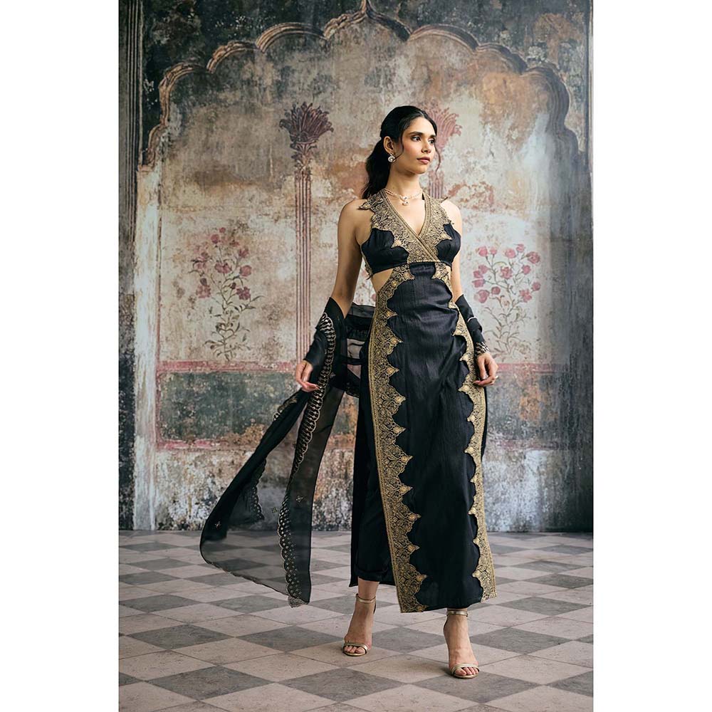 Description : The Kaia black and gold hand-embroidered kurta set is a bold fusion of contemporary tailoring and traditional craftsmanship. Designed in a sleek silhouette, it offers a dramatic reinterpretation of the kurta, making it a standout choice for festive evenings and cocktail celebrations. Kurta design - crafted in a luxurious black base with a halter-inspired neckline, the kurta features sculpted cut-outs at the sides and a plunging V-neck. Golden embroidery frames the neckline and runs along the front and back panels, creating an elongated, regal finish. The crisscross open back adds a modern edge while maintaining couture refinement. Pants - paired with slim black pants that balance the intricacy of the kurta with a clean, tailored base. Comfortable yet polished, they complete the look with structure and sophistication. Dupatta - a sheer black dupatta edged with delicate golden embroidery. Lightweight and elegant, it softens the boldness of the kurta with fluid grace. Craftsmanship - intricate hand embroidery in golden thread elevates the sleek black silhouette. Each motif is carefully executed by artisans, ensuring precision, durability, and luxury-level detailing.