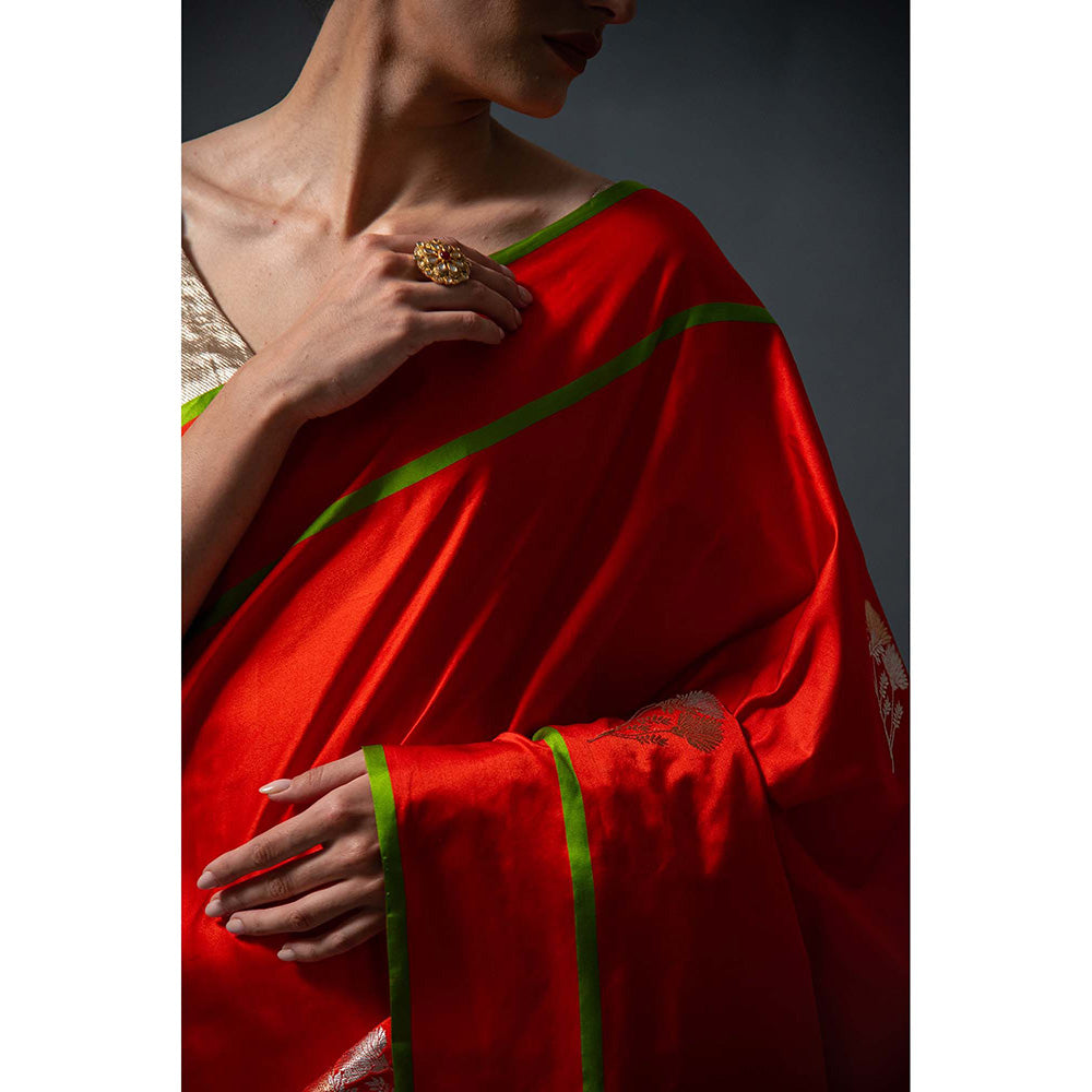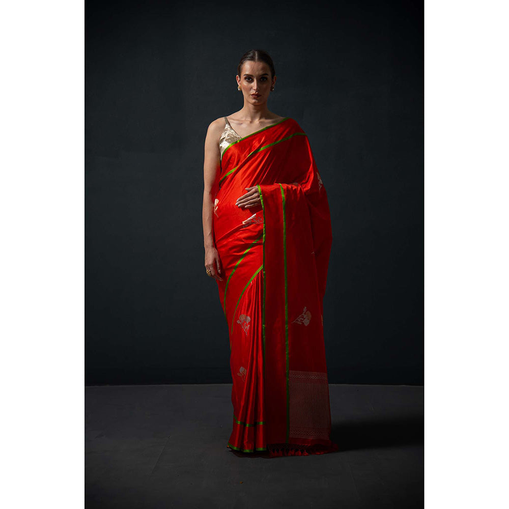 Sacred Weaves Red Booti Satin Silk Handloom Banarasi Saree Without Blouse