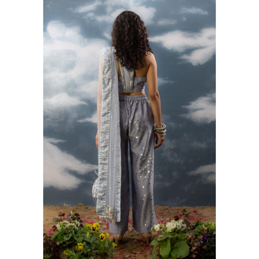 Description : Blue Hand Embroidered Set in Chanderi Handcrafted in chanderi Hand embroidered in metallic silver Top is sleeveless, halter neck, features hand embroidery Comes with hand embroidered flared pants in chanderi Paired with matching blue sheer net dupatta with hand embroidered border. It also comes with Hand embroidered silver belt Components: 4Potli is for styling purpose only and can be purchased separately