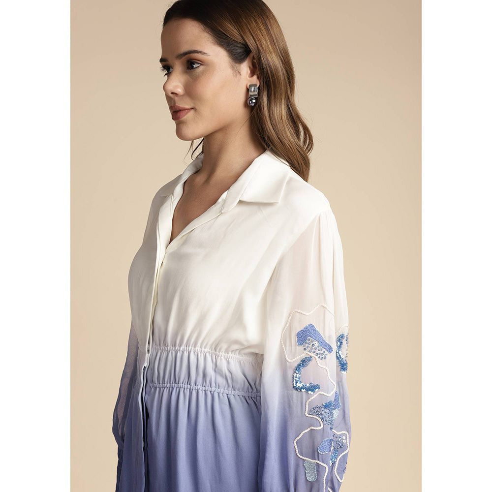 Description : Ombre' High-Low Shirt With Intricate Sequence & Dori Embroidery On Sleeves With Thin Collar And Elasticated Cuffs. Paired With Embroidered Bell Bottom Pants