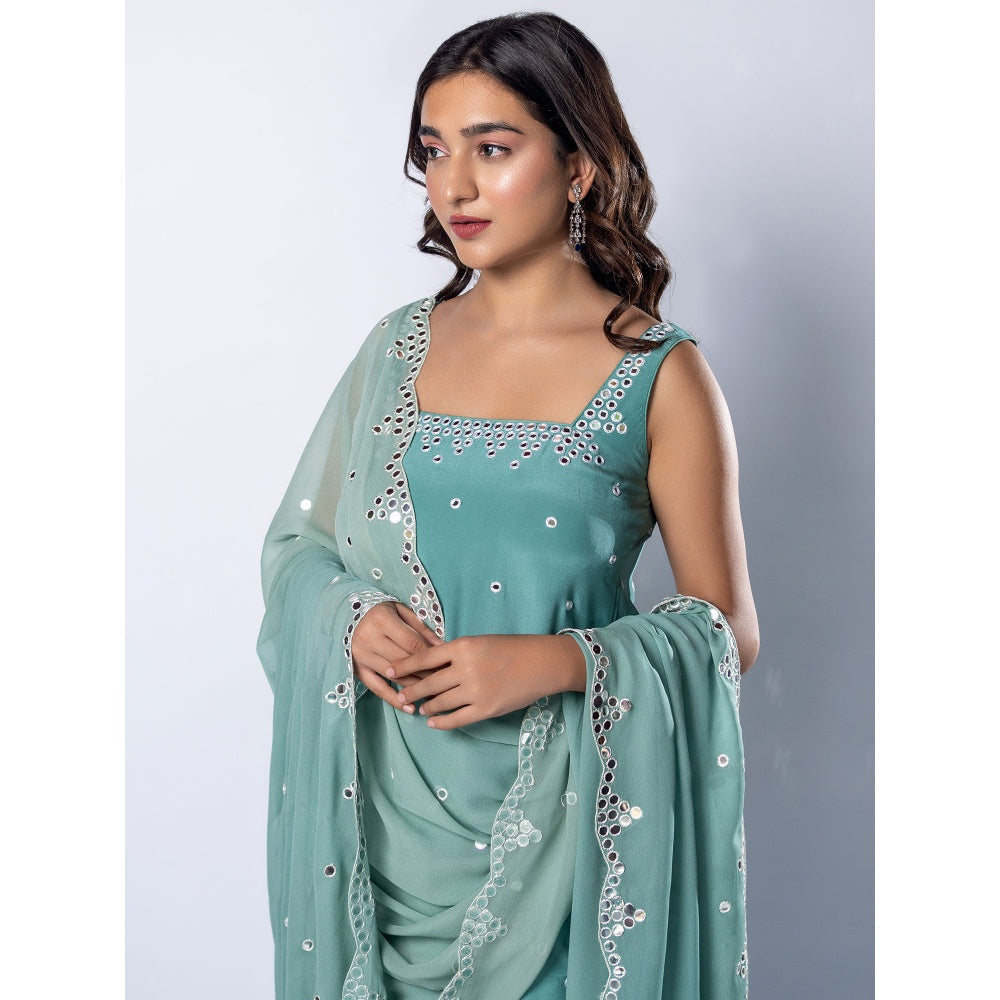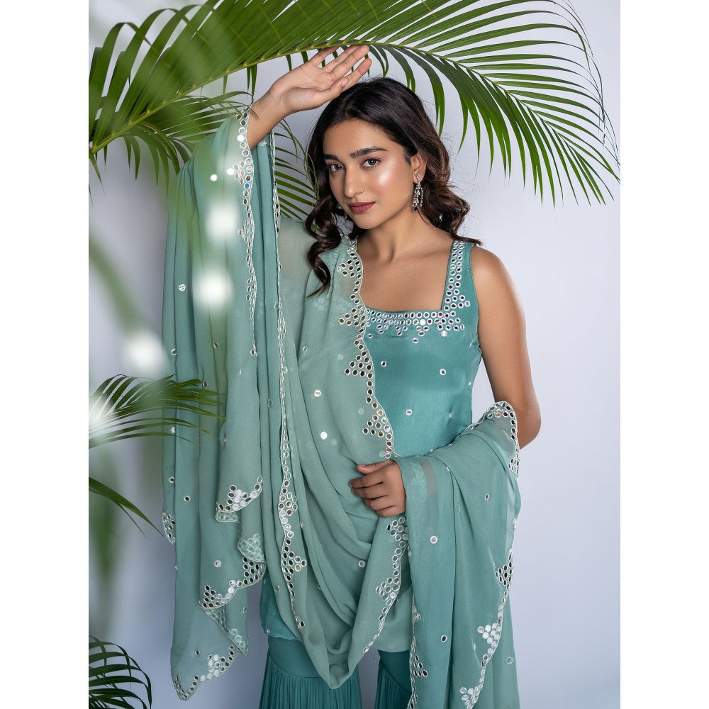 Shahmeen Husain Blue Mirror Work Sharara (Set of 3)