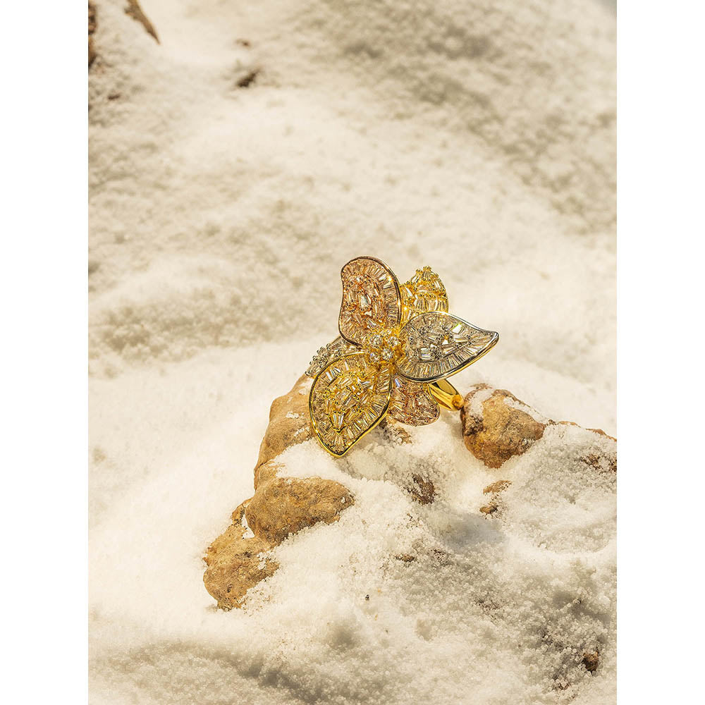 Description : Break free from the ordinary with The Ice Crystal ring, a rebel from the Floral Miles collection. Shattering expectations of "travel jewellery" this piece is designed to stir your adventurous spirit. It showcases zirconia stones known for their lifelike 3D texture and unparalleled clarity. Each stone, meticulously chosen for its precise cut, bursts with brilliance, evoking the magic of frozen crystals. But the magic goes deeper. This ring is a masterful blend of materials, weaving a touch of otherworldly intrigue. It's more than an ornament; it's a travel essential that transforms your holiday attire into a conversation starter.