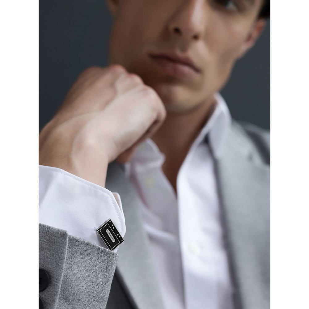 Description : Not your regular cufflinks, the Mixtape cufflinks in silver and black features the revolutionary cassettes of the 70s. A statement hint to the affinity in music, the piece is designed with a bold black enamelling. Designed with an eye for detail, these cufflinks capture classic features of the audio tape. Part accessory, part conversation starter, these quirky cufflinks will add a touch of personality to your ensemble. Cufflink shape Radio Shape
