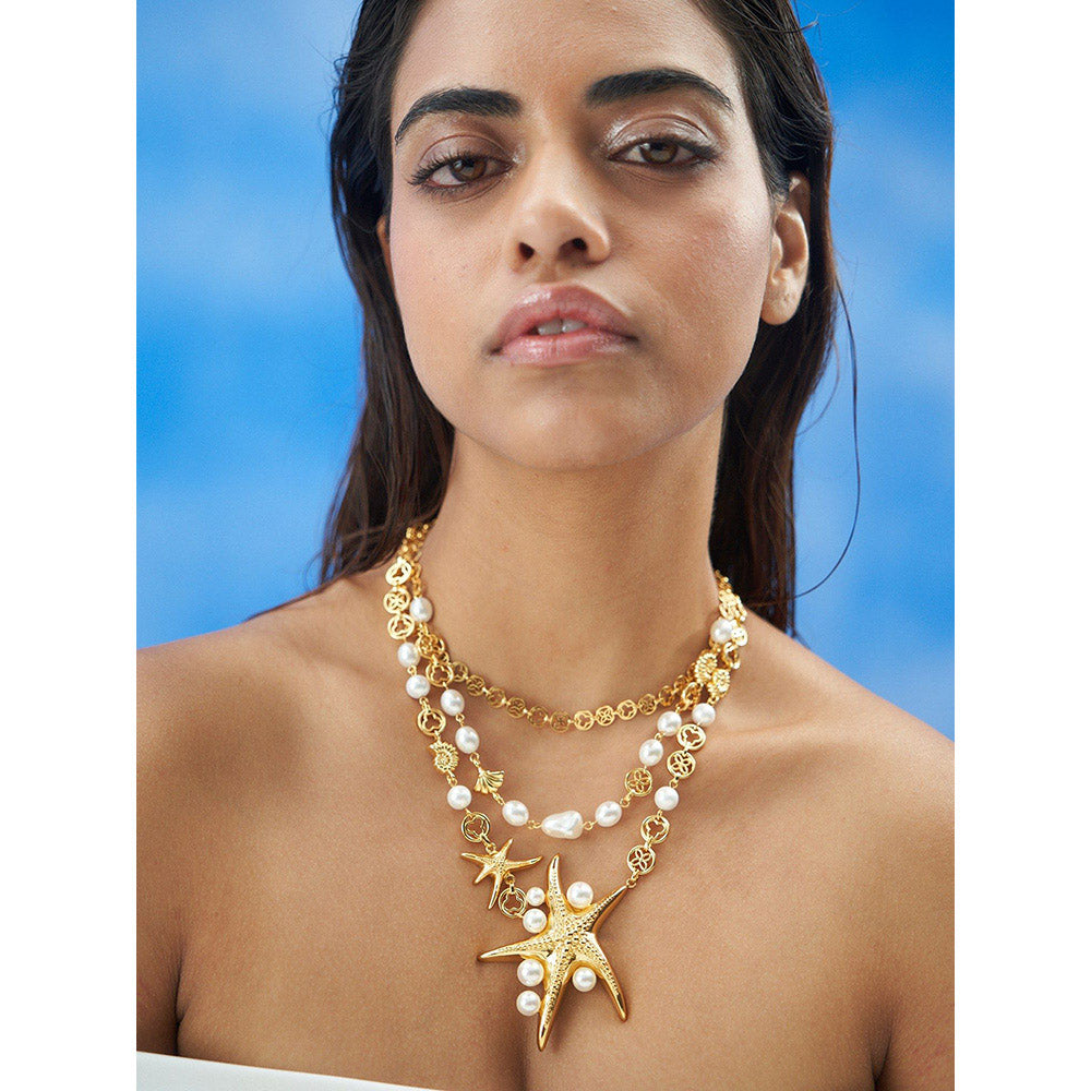 Description : The Ocean s Orchestra necklace feature as a statement design from the Ocean s Muse collection designed in collaboration with Deme. The collection celebrates the mystique of the deep and bold character of the woman that commands the ocean. The golden necklace s design showcases its inspiration of underwater flora and fauna with marine motifs. This layered piece of jewellery is an inspiring orchestration in design. Its sturdied brass body showcases the high sheen gold cloak achieved only through masterful skill. Transition from dinner party chic to after party unstudied style.