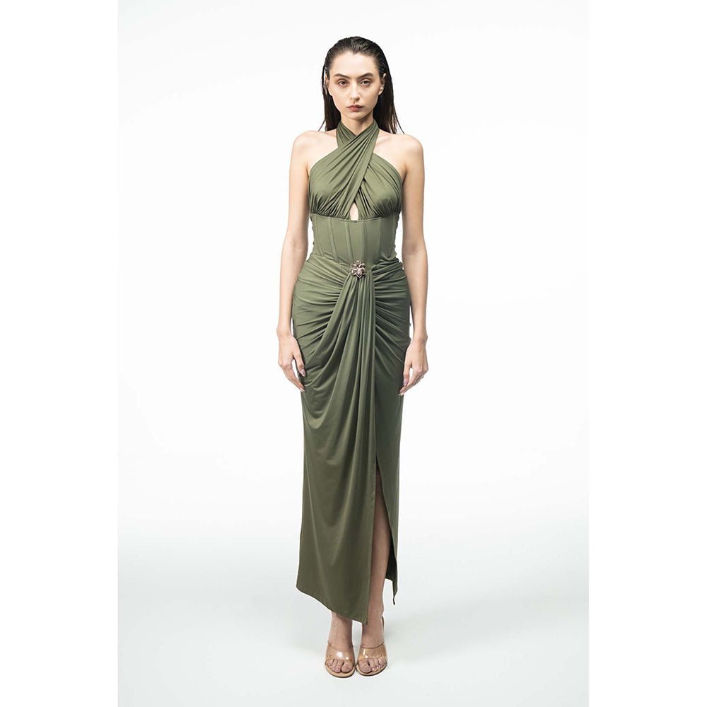 Description : Elegant Green Dress Featuring A Cross-Front Halter Neckline With A Soft Front Cut-Out. Designed With A Sculpted Waist, Gathered Draping, And A Metal Trim At The Center. Finished With A Front Slit.
