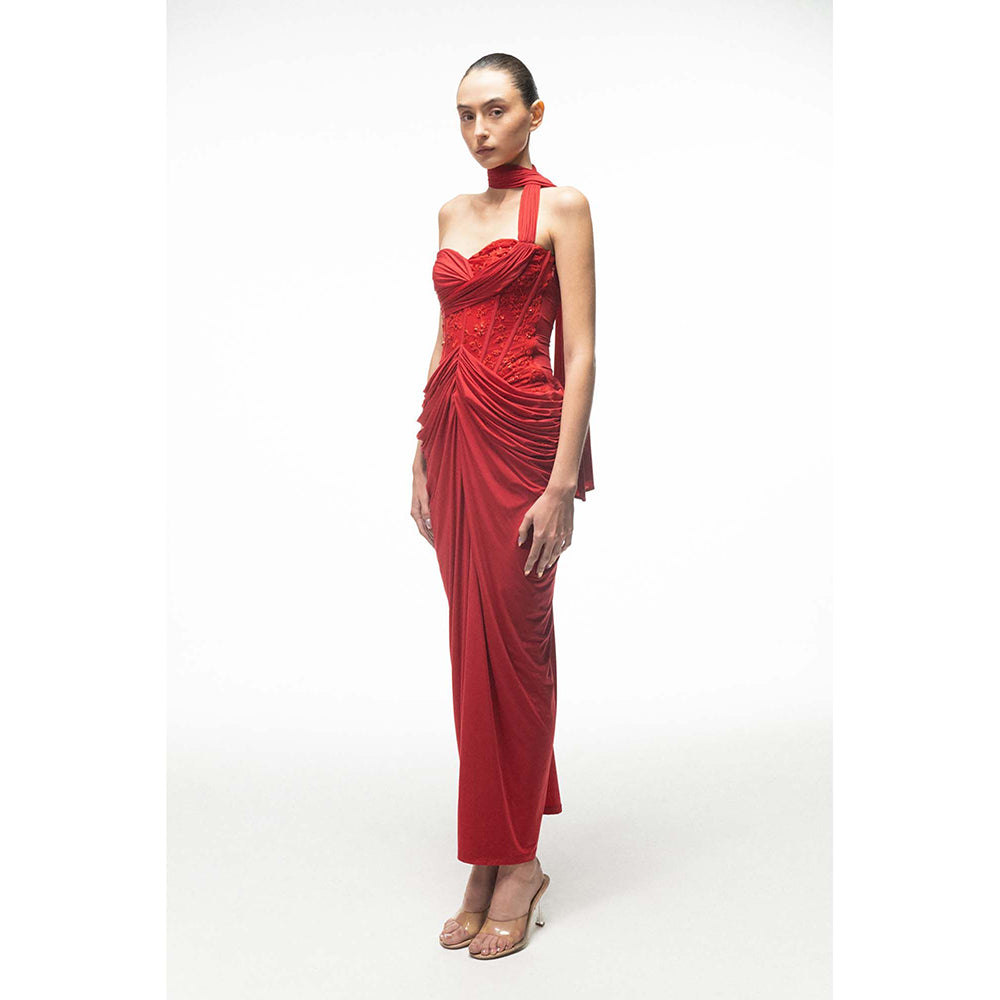Description : A Red Dress Featuring A Structured Bodice With Soft Draping At The Waist. Designed With An Asymmetric Neckline, Attached Neck Wrap, And Gathered Skirt That Creates A Clean, Sculpted Silhouette.