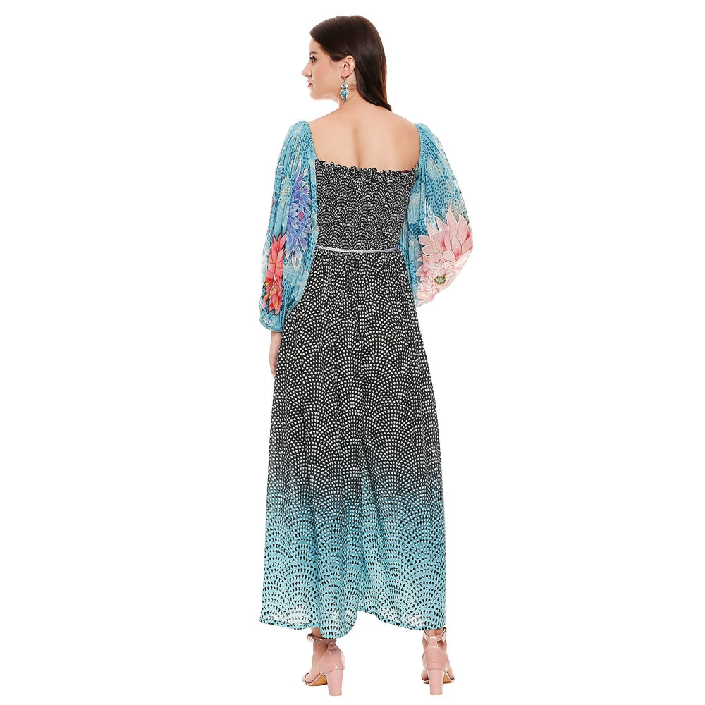 Description : smocking printed dress with baloon sleeves paired with silver belt at waist
