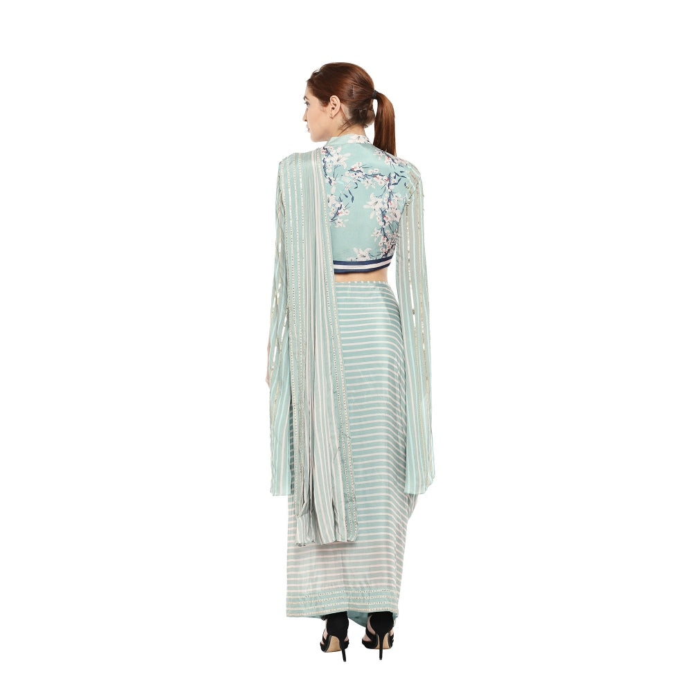 Description : This set by Soup by Saugat is crafted in crepe. It features a hand embroidered and florap short jacket paired with a pre-draped sari. Swap out your traditional sari for this modern ensemble for your next soira e. Accesorize with large earrings and stacked bangles to complete the look.