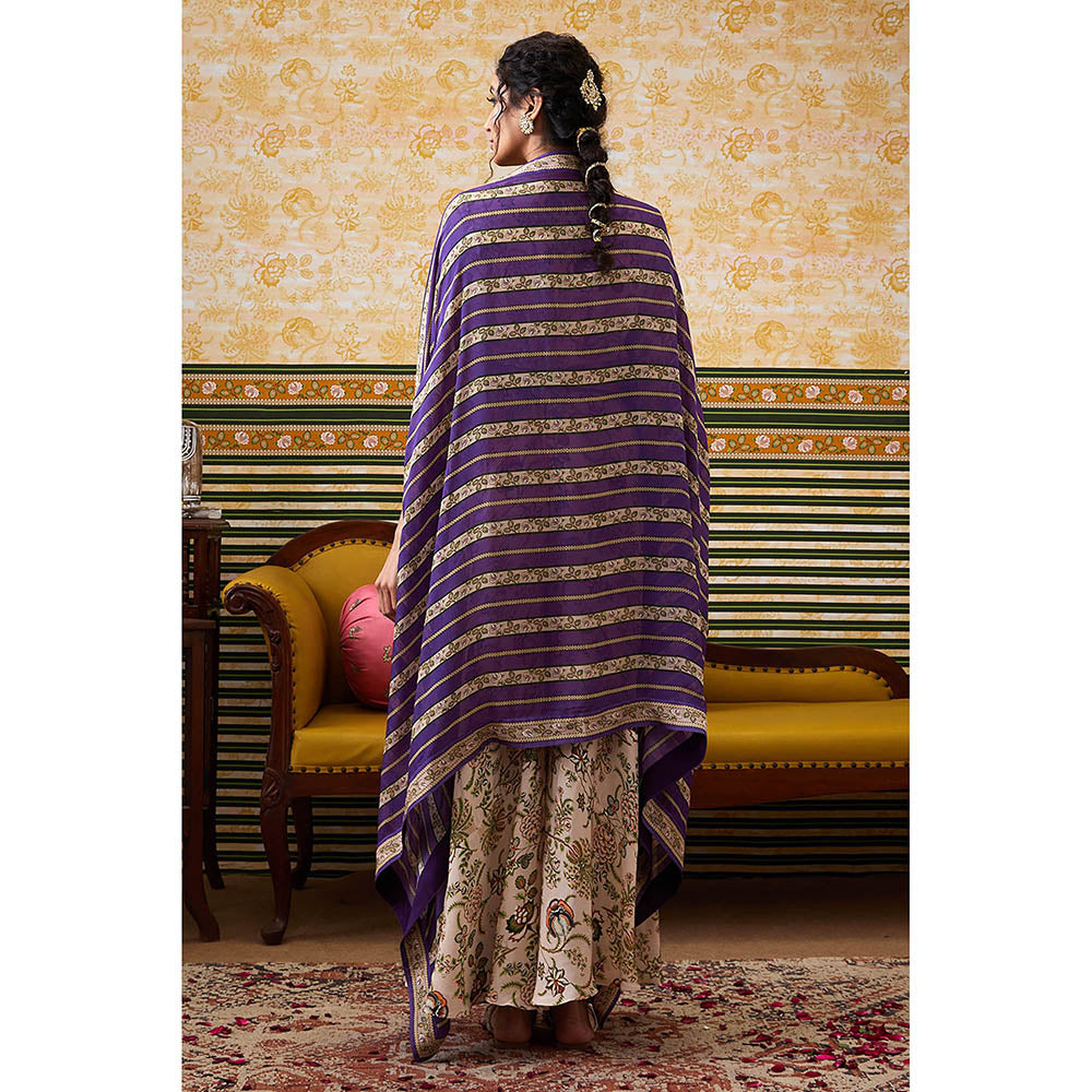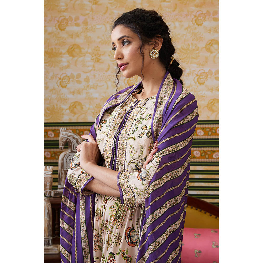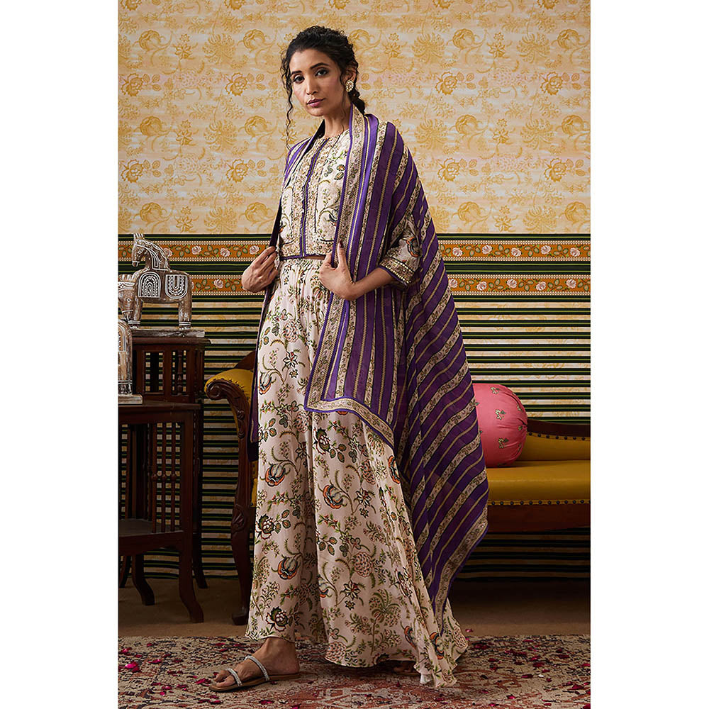 Mehr Cream Floral Crop Top with Skirt and Cape (Set of 3)