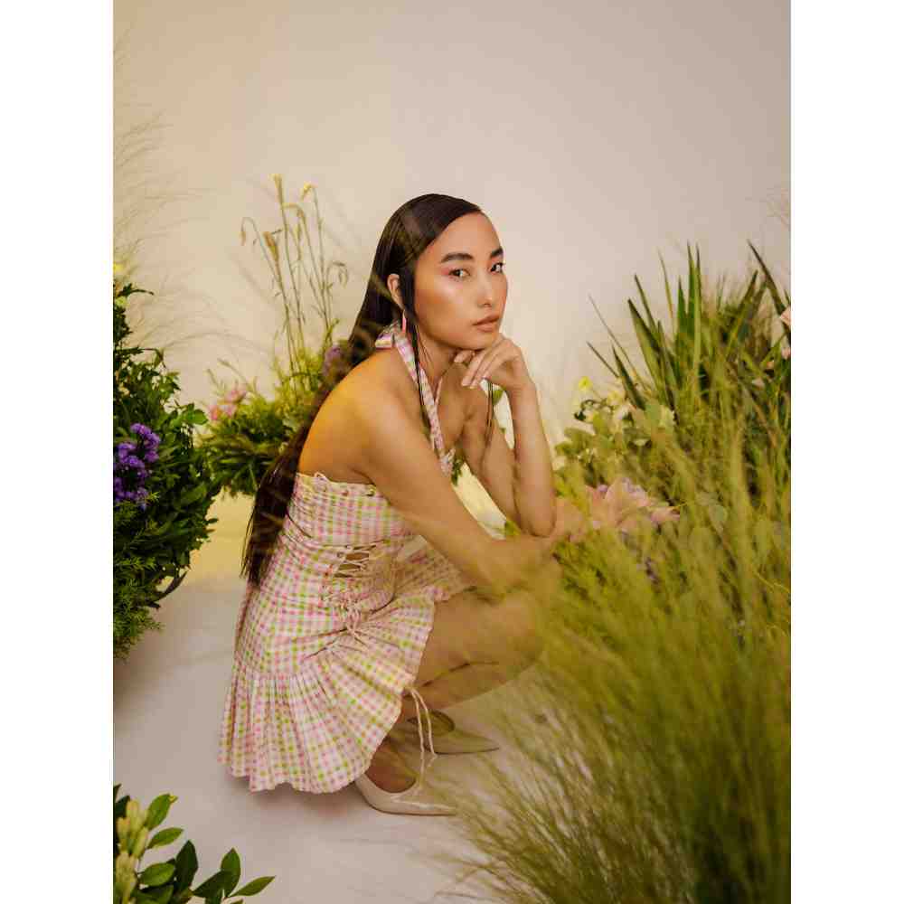Description : A Corset Fit Halter Top Paired With Fit And Flair Mini Skirt Made In Sear-Sucker Cotton Gingham Checks Fabric, Detailed With Rivieting And Criss Cross Rounded Tie Up, Back Metal Zipper Closure.
