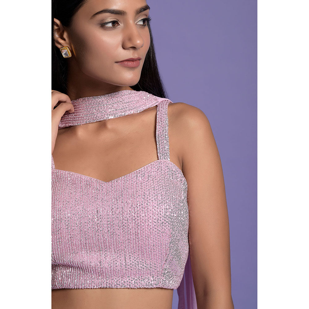 Description : Indulge In Luxury With Our Pink Flowing Chinnon High Waisted Pants And Crop Top Set. The Intricately Embellished Crop Top Boasts Monotonal Sequin Embroidery, Adding A Subtle Yet Stunning Shine. Paired With Matching High Waisted Pants, Expertly Crafted With A Dramatic And Flared Kali In The Middle. Complete Your Look With The Elegant Dupatta, Structured Around The Neck And Flowing Gracefully At The Back.