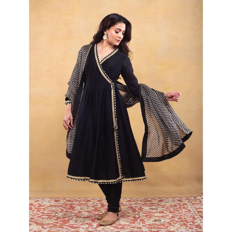 Description : Black Embroidered Chanderi Angrakha Paired With Churidar And Black Butti Dupatta With Back Finish