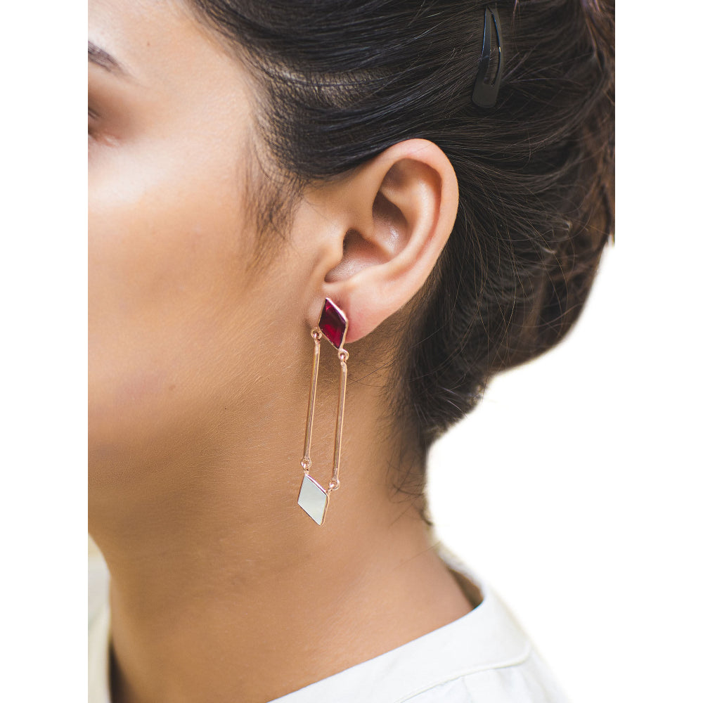 Description : Rose gold plated earrings with pink quartz & white mop semiprecious stone. hand made in India.