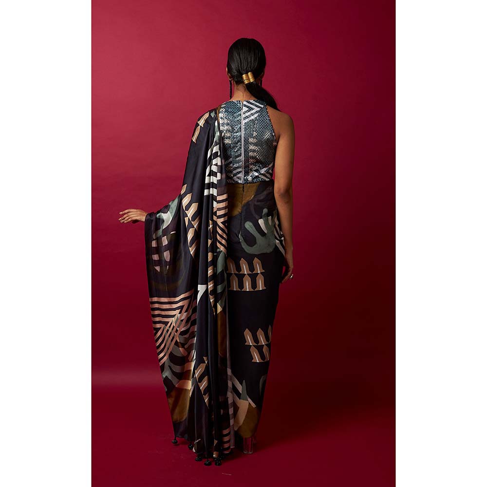 Description : Channel your inner diva with this multi-colour saree from Vedika M. Crafted from satin fabric. It features an exquisite printed design. It is paired with a sleeveless design blouse. Style it with a pair of heels and diamond earrings for an elegant look.