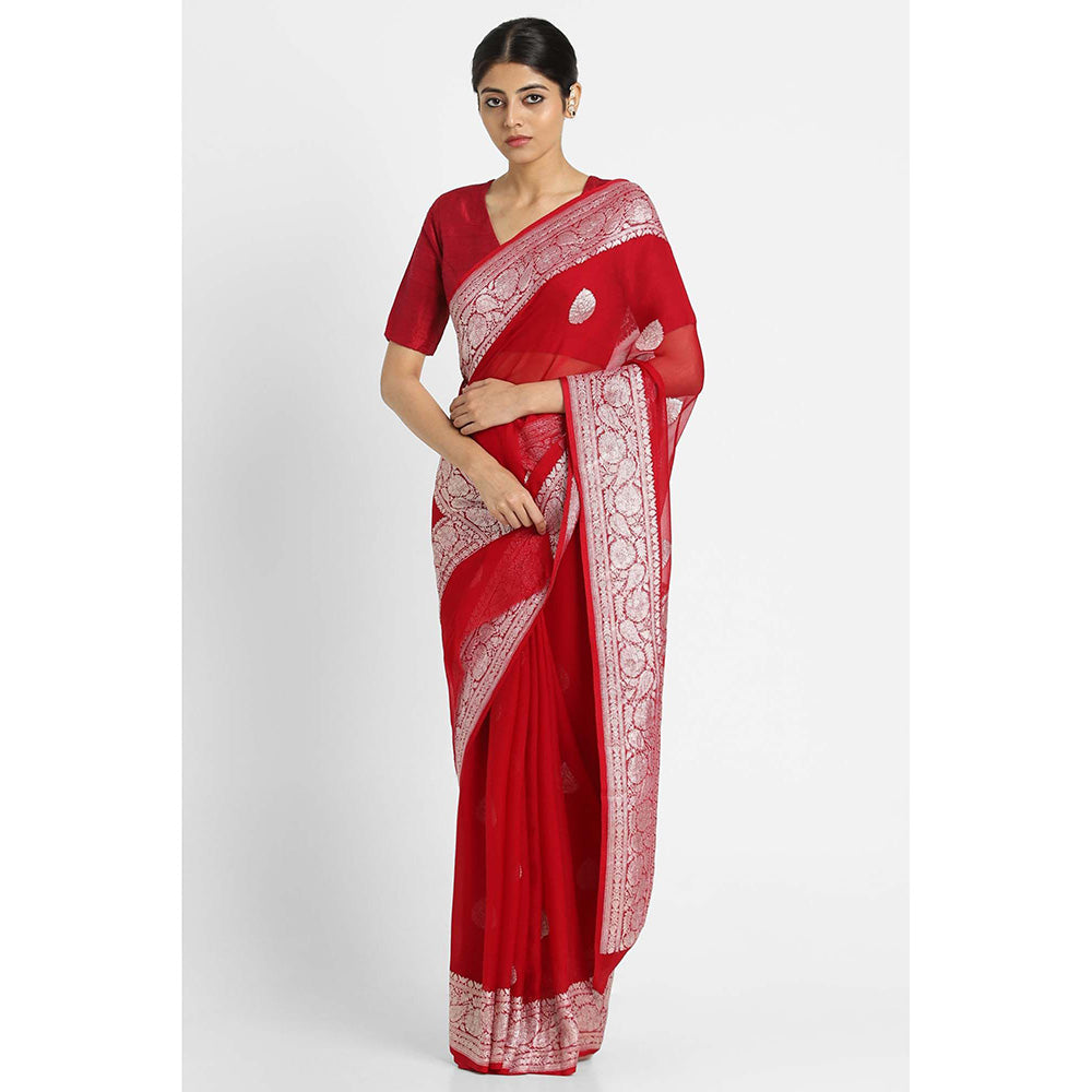 Via East Red Georgette Banarasi Saree with Unstitched Blouse
