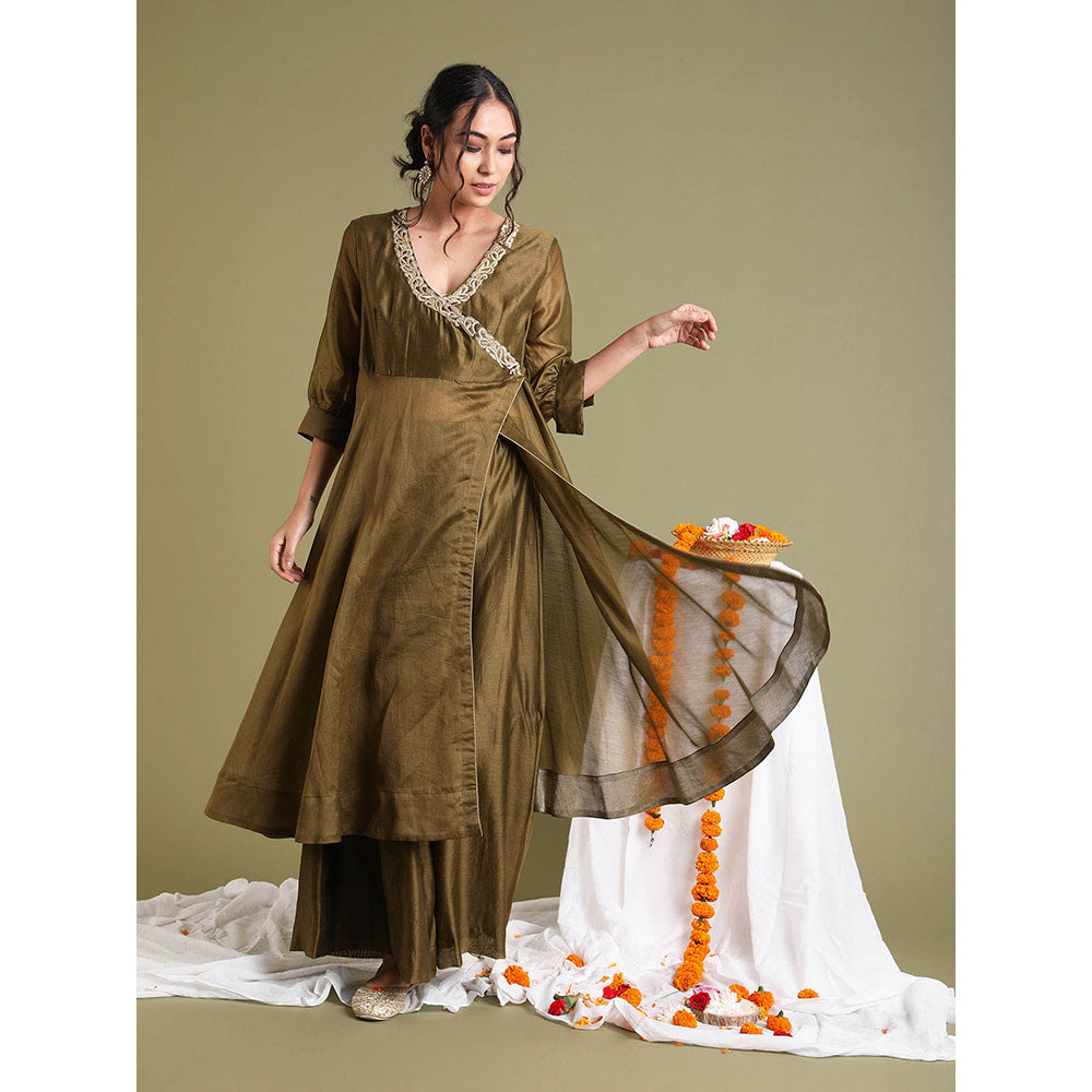 Description : Chanderi Wrap Around Anarkali Kurta with High Slits and Side Closure. Floral Gold Embroidery On Neckline, Tissue Facing On The Hem and Edges, with Smart Gathered Sleeves. Kurta Bodice Is Lined, Flared Skirt Has A Sheer Feel. Paired with A Chanderi Flared Palazzo In Tabacco Brown To Match. Versatile Design For Your Festive Look and Formal Wear There After. -Handcrafted In India-100% Authentic & Pure Chanderi Fabric-Gold Thread Embroidery & Tissue Trims-Kurta Bodice and Palazzo Are Lined-Garment Made On Order-Model Is Wearing Size S, and Height Is 5a 7a a -See The Size Chart & The Size Guide Carefully the Handwoven Fabric Used In This Garment Is Certified Handloom Made In Chanderi, Madhya Pradesh. The Product Is Handmade, Thus May Have Some Irregularities Common To Handicraft