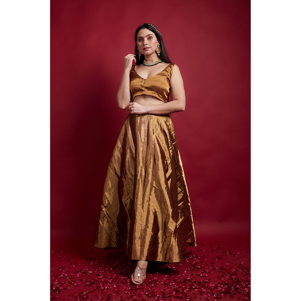 Description : Level Up Your Look With This Gold Lehenga Choli From Vinusto. Crafted From Chanderi, It Is Finished With A Sleeveless Design And V-Neck. Complete The Look With A Pair Of Heels And Exquisite Jewellery Pieces.