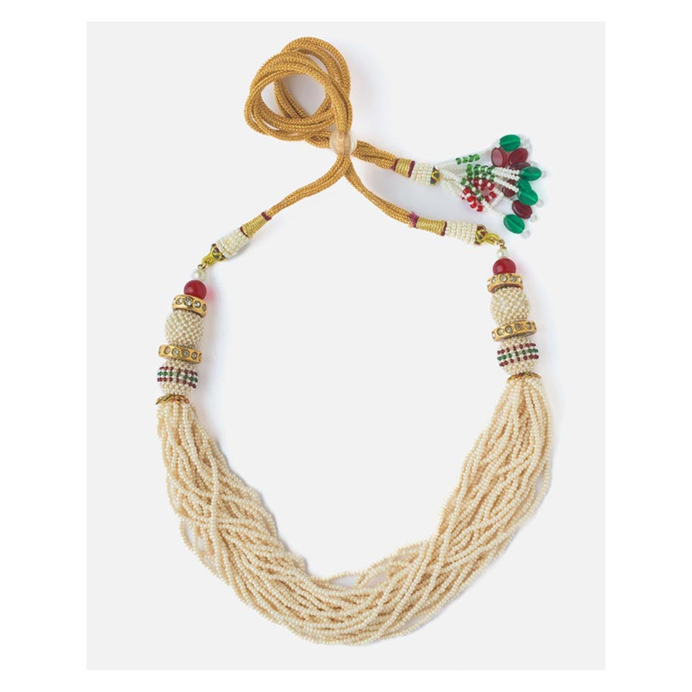 Description : Elegant multi-strand pearl necklace with intricate beadwork, golden accents, and red-green tassels. Perfect for weddings, festivals, and traditional occasions. Handcrafted to reflect timeless beauty.