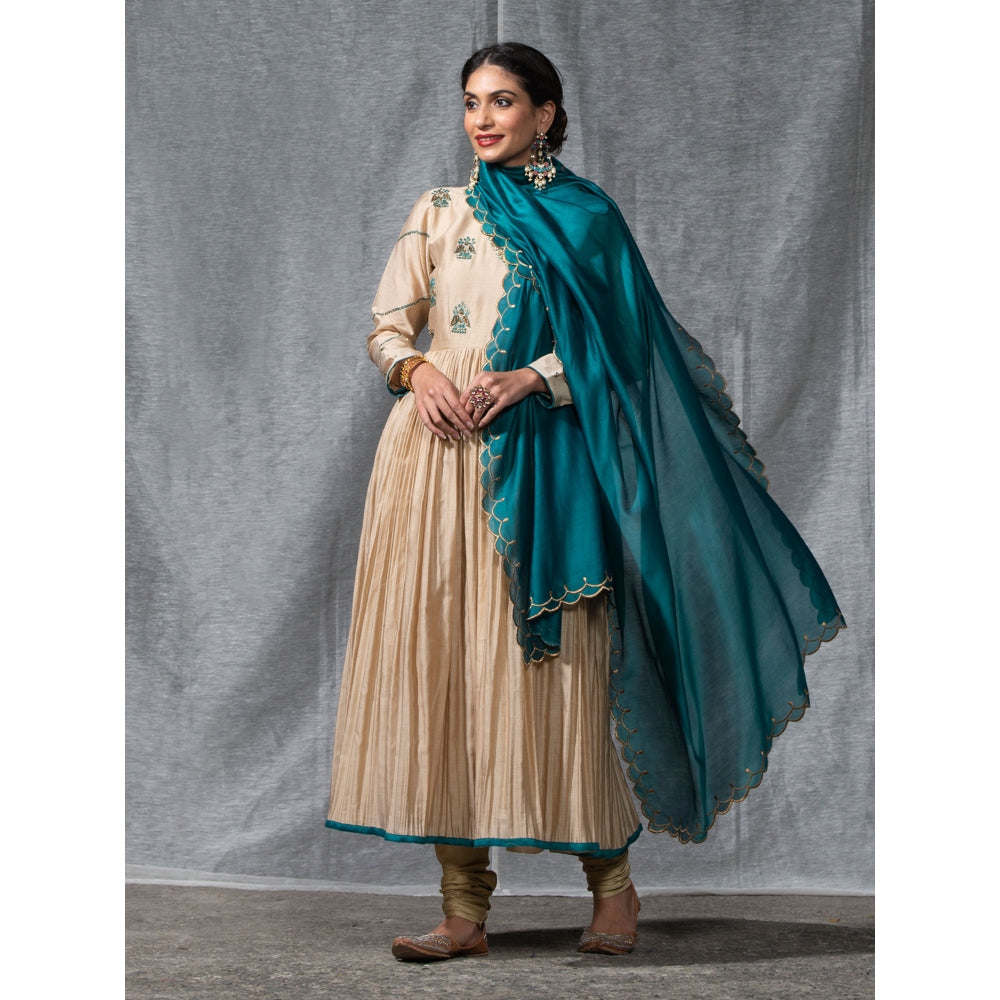 Beige Pleated Chanderi Silk Zardozi Kurta with Churidar and Dupatta (Set of 3)
