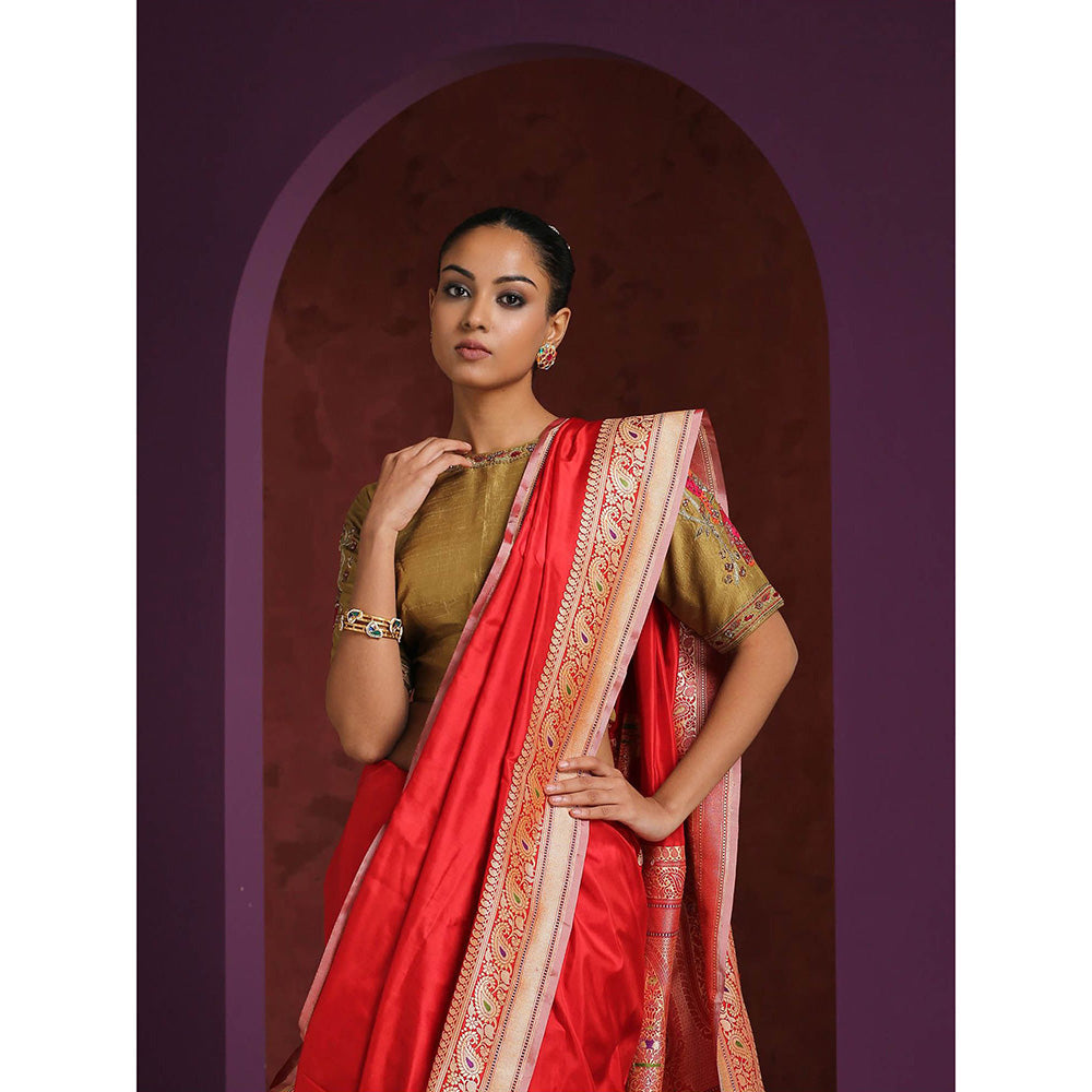 WeaverStory Gold Raw Silk Blouse with Hand Embroidered Bird Motif