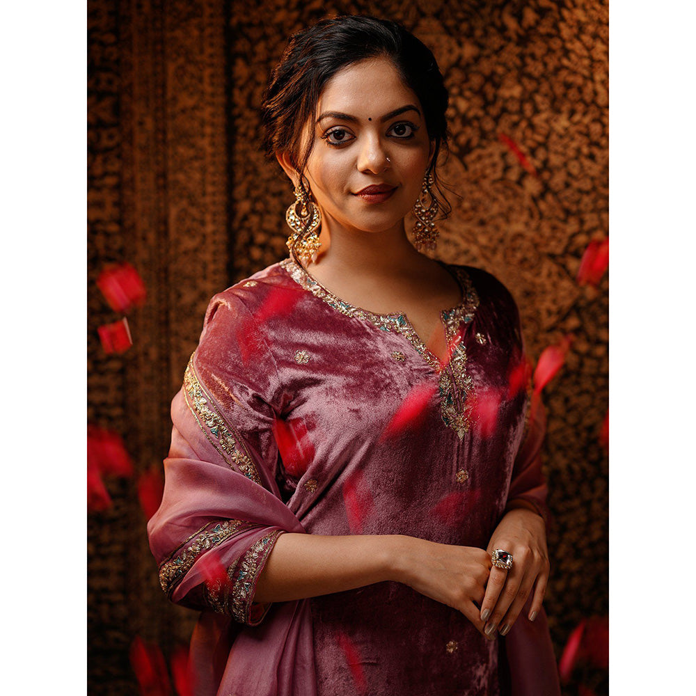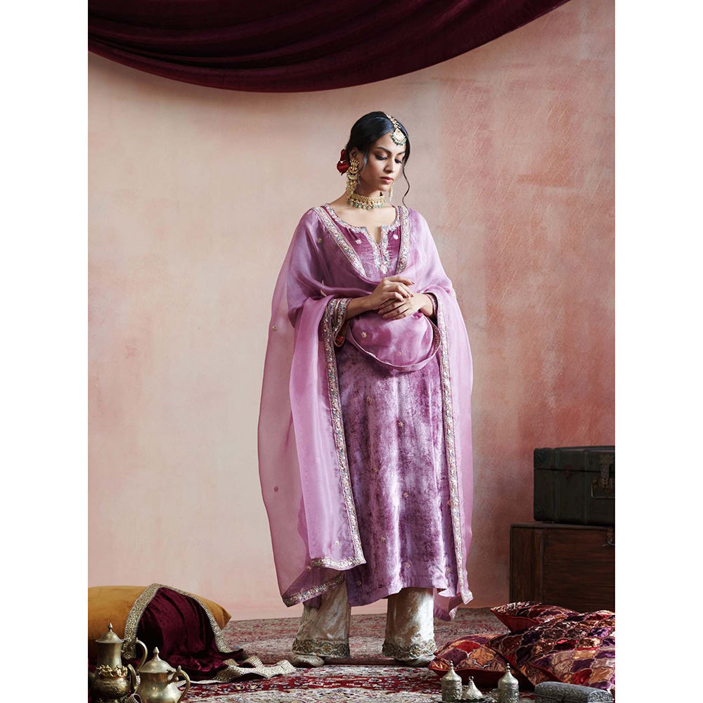 Description : Embody poised elegance in this purple kurta set from WeaverStory. Fashioned from velvet and adorned with zardozi work, the kurta is finished with Three Fourth Sleeves and a Round neckline. The kurta is accompanied by a matching farshi and dupatta to complete the ensemble.