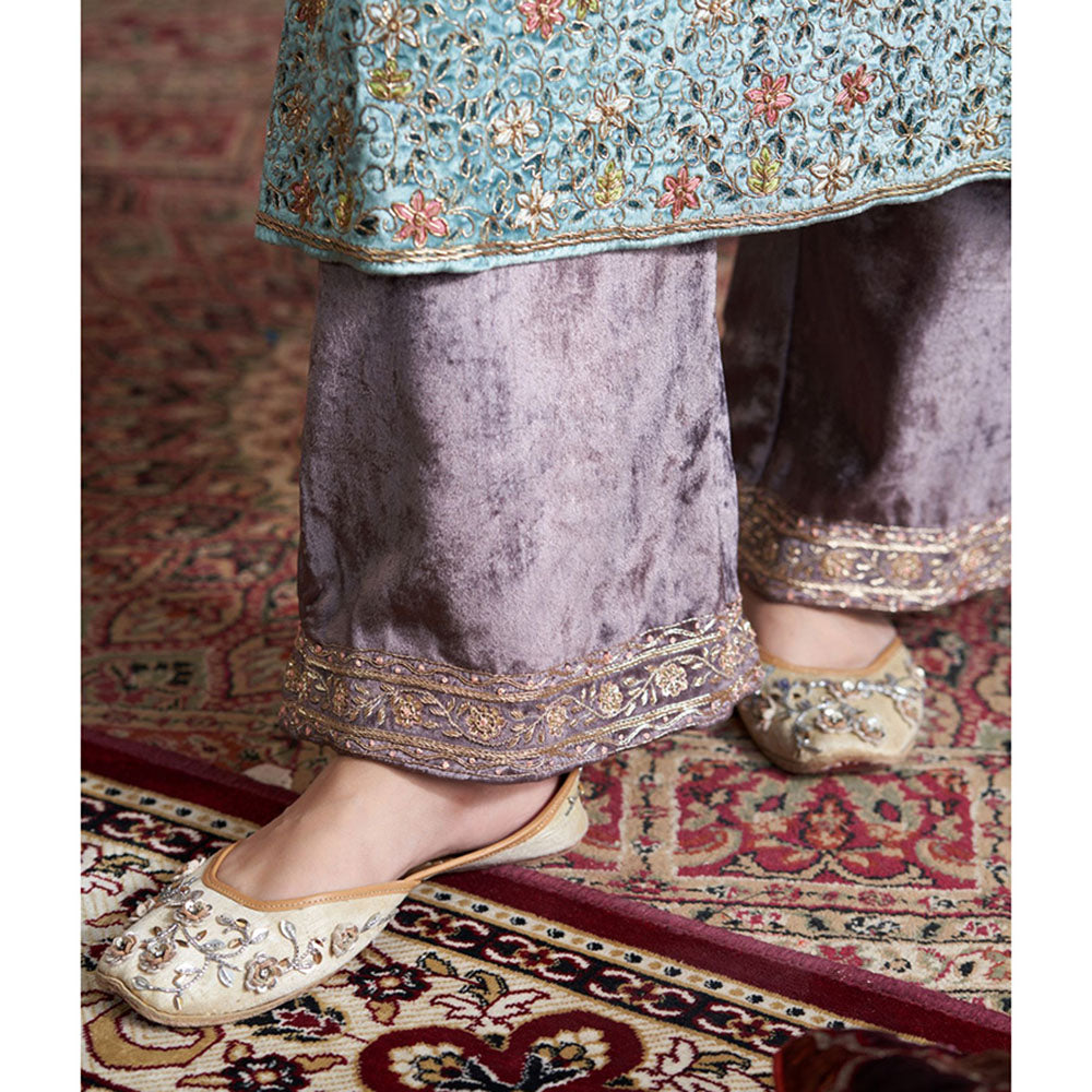 Ice Blue Hand Embroidered Kurta with Grey Farshi & Organza Dupatta (Set of 3)