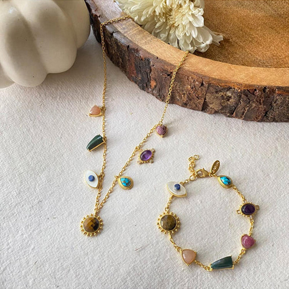 can be stacked with other bracelets or a watch for a more eclectic style. 22kt gold plated necklace: features 7 gemstone drops designed to connect with your body's chakras.