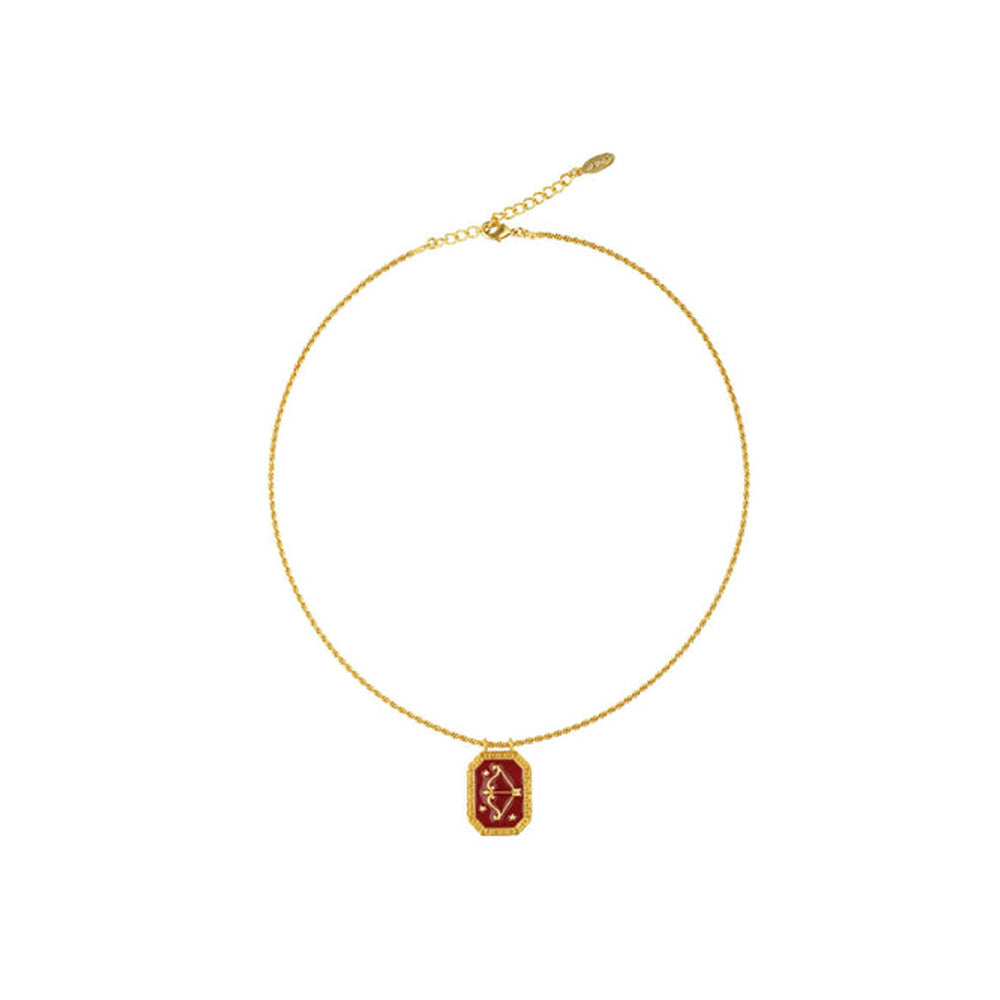 Description : A handcrafted talisman to celebrate your cosmic connection and be a star child . The 22kt gold plated zodiac tablet necklace will make you feel extremely special and we promise that you wouldn't want to take it off! The enamelled base is detailed with a sculptured motif of the the archer - which is the symbol of the sagittarius zodiac. symbol - the archer for people born between november 22 to december 21.